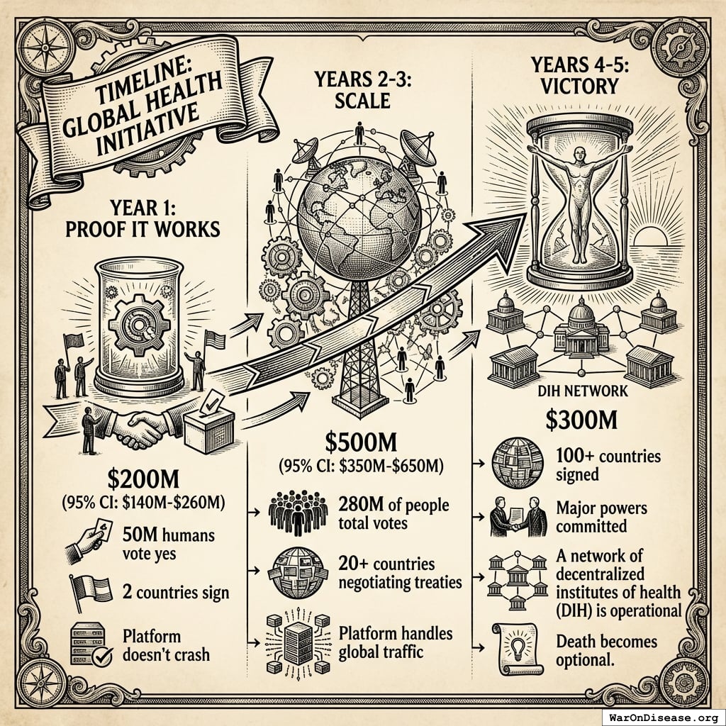 A five-year project timeline visualizing the rapid scaling of budget, voter participation, and treaty adoption from the proof-of-concept phase to global implementation.