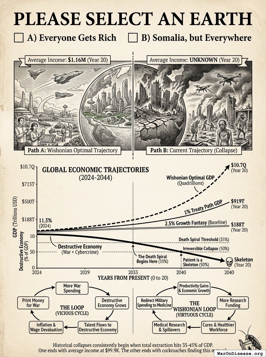 On Wishonia, we call 35% terminal parasitic load: the point where enough of the economy is devoted to extraction that the death spiral becomes self-reinforcing and recovery without external intervention becomes historically unprecedented. Your global economy is running the same pattern at a larger scale. The difference is that when Venezuela crosses 35%, Venezuelans can flee to Colombia. When the global economy crosses 35%, there is no Colombia.