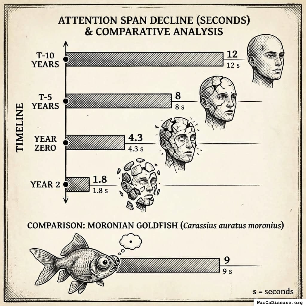 For comparison, a Moronian goldfish (similar to yours) could focus for 9 seconds. By Year 2, the goldfish had superior attention spans. But the goldfish didn’t control nuclear weapons, so I suppose that balanced out.