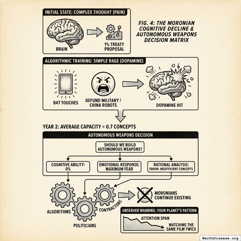 Then - and I found this part notable - the same algorithms that reduced their attention spans got used to train the military AI. So the military AI learned Moronian decision-making patterns: emotional, reactive, manipulable, attention span below 2 seconds.
