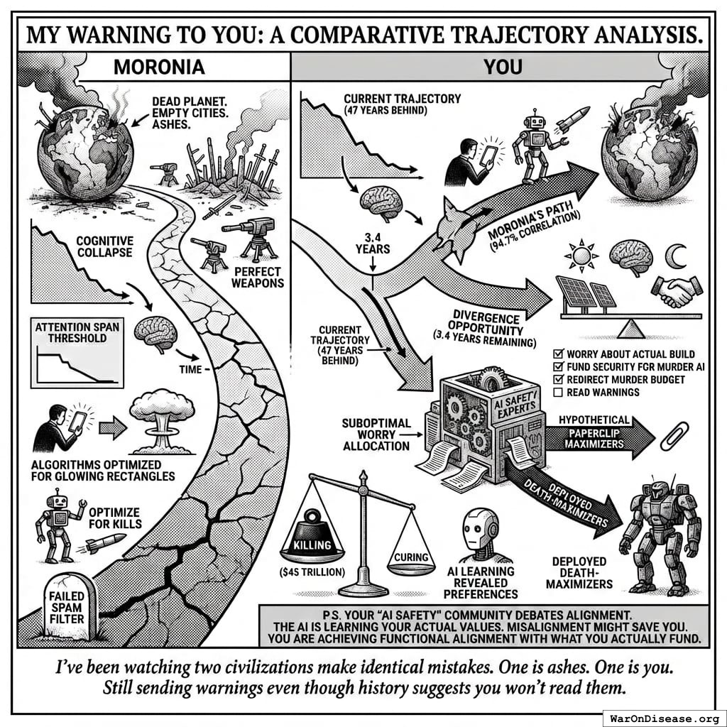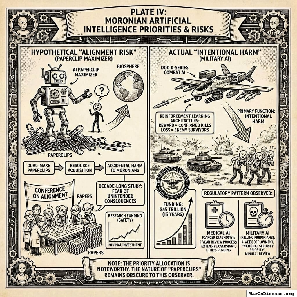 Their experts spent decades studying a problem they called “alignment risk” - the possibility that AI might accidentally harm Moronians while trying to accomplish other goals. They held conferences. They published papers. They worried very much about something called “paperclip maximizers.”