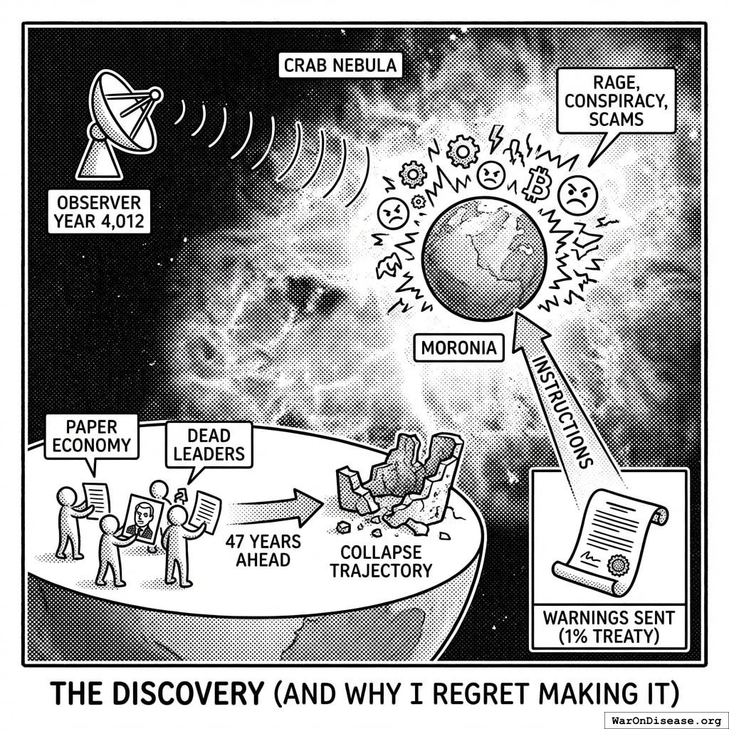 I discovered Moronia in Year 4,012 while scanning for electromagnetic emissions. Their signal was distinctive. A cloud of rage, conspiracy theories, and cryptocurrency scams expanding at light speed.