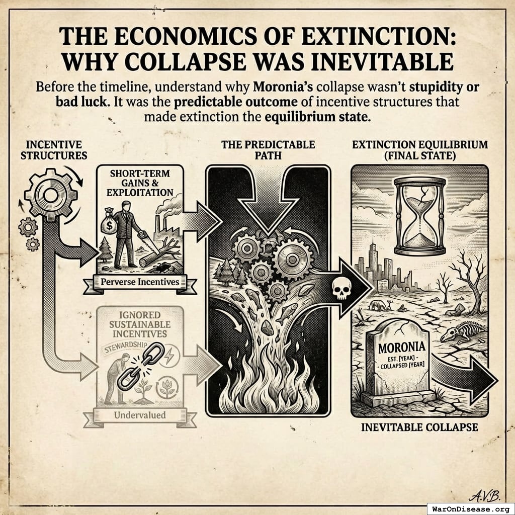 Before the timeline, you should understand why Moronia’s collapse wasn’t stupidity or bad luck. It was the predictable outcome of incentive structures that made extinction the equilibrium state.