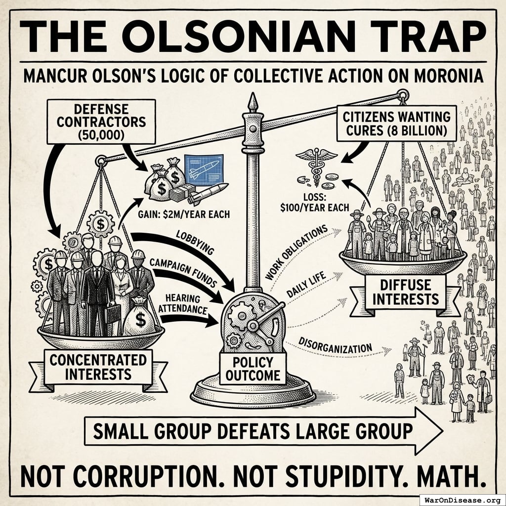 Mancur Olson documented a pattern: small groups with concentrated interests always defeat large groups with diffuse interests. On Moronia: