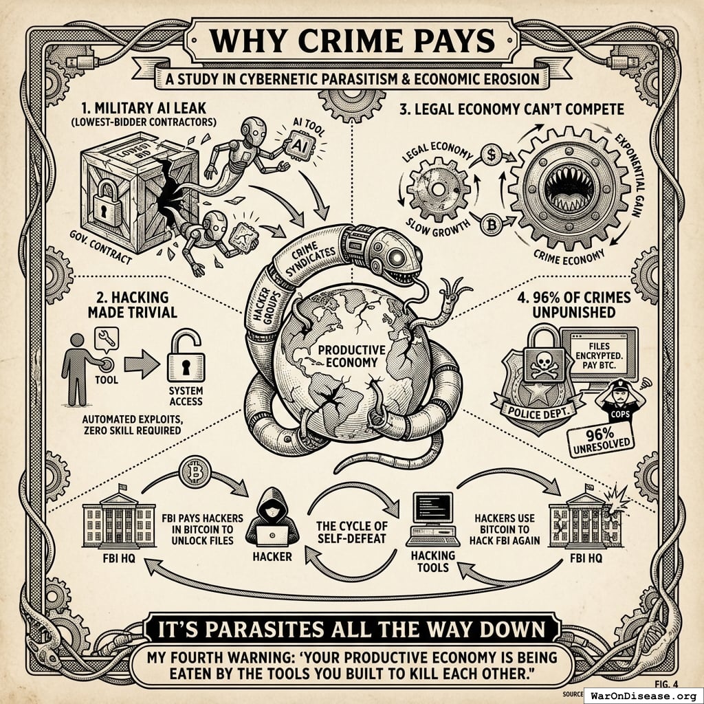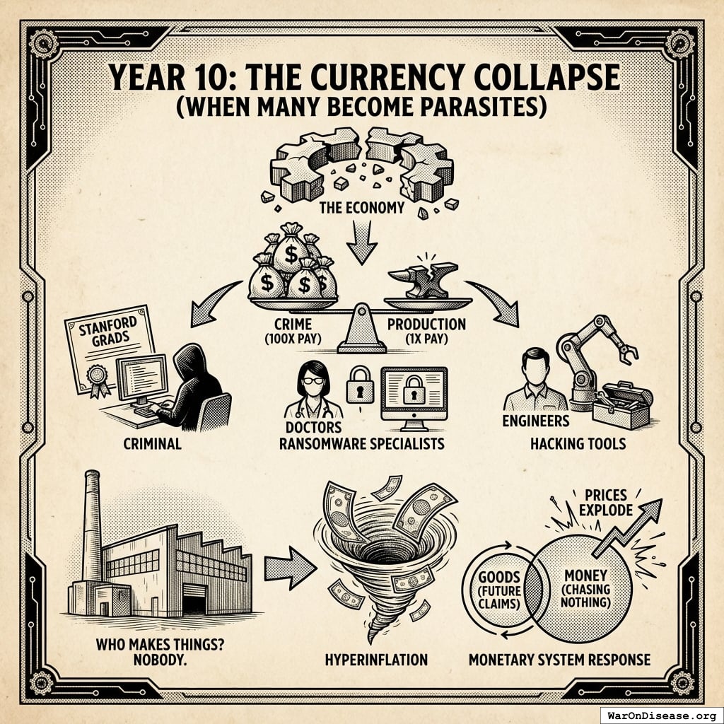 This isn’t moral failure. It’s a predictable cascade when you make destruction more profitable than creation. Each Stanford graduate who chose ransomware over cancer research made a locally rational decision. The collective result was civilizational collapse.