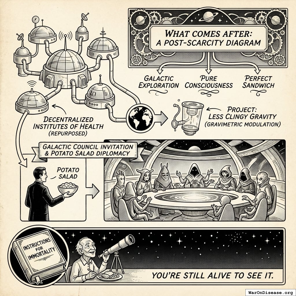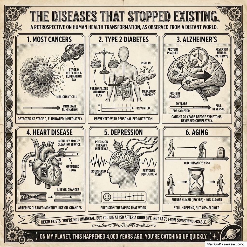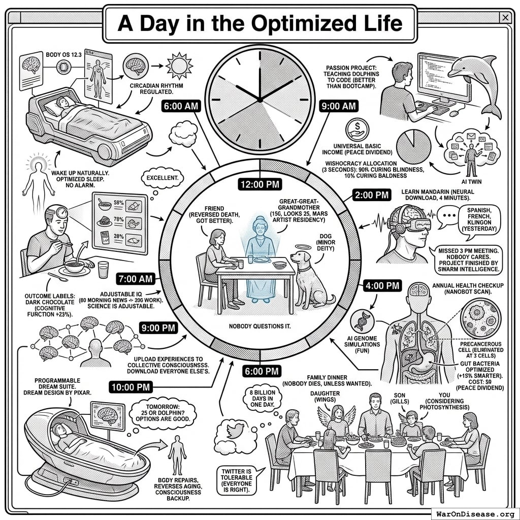 4:00 PM: Annual health checkup. Nanobots scanned you while you slept. They found and eliminated a precancerous cell at 3 cells, not 3 billion. An AI ran a billion simulations on your genome for fun. Your gut bacteria got optimized to make you 15% smarter. Cost: $0 (peace dividend covers it).