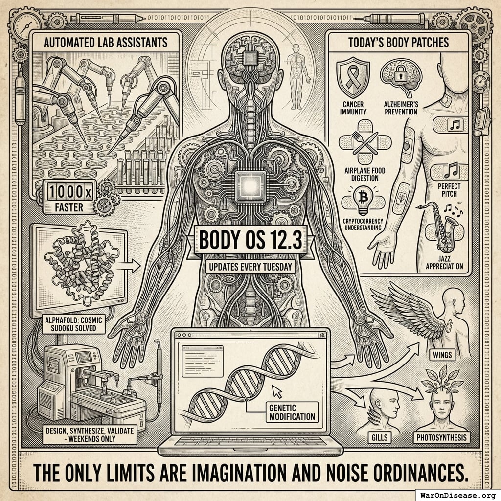 Robot lab assistants perform experiments 1,000 times faster than humans. AlphaFold maps every protein like solving cosmic sudoku. Drug companies design, synthesize, and validate new treatments in weekends.