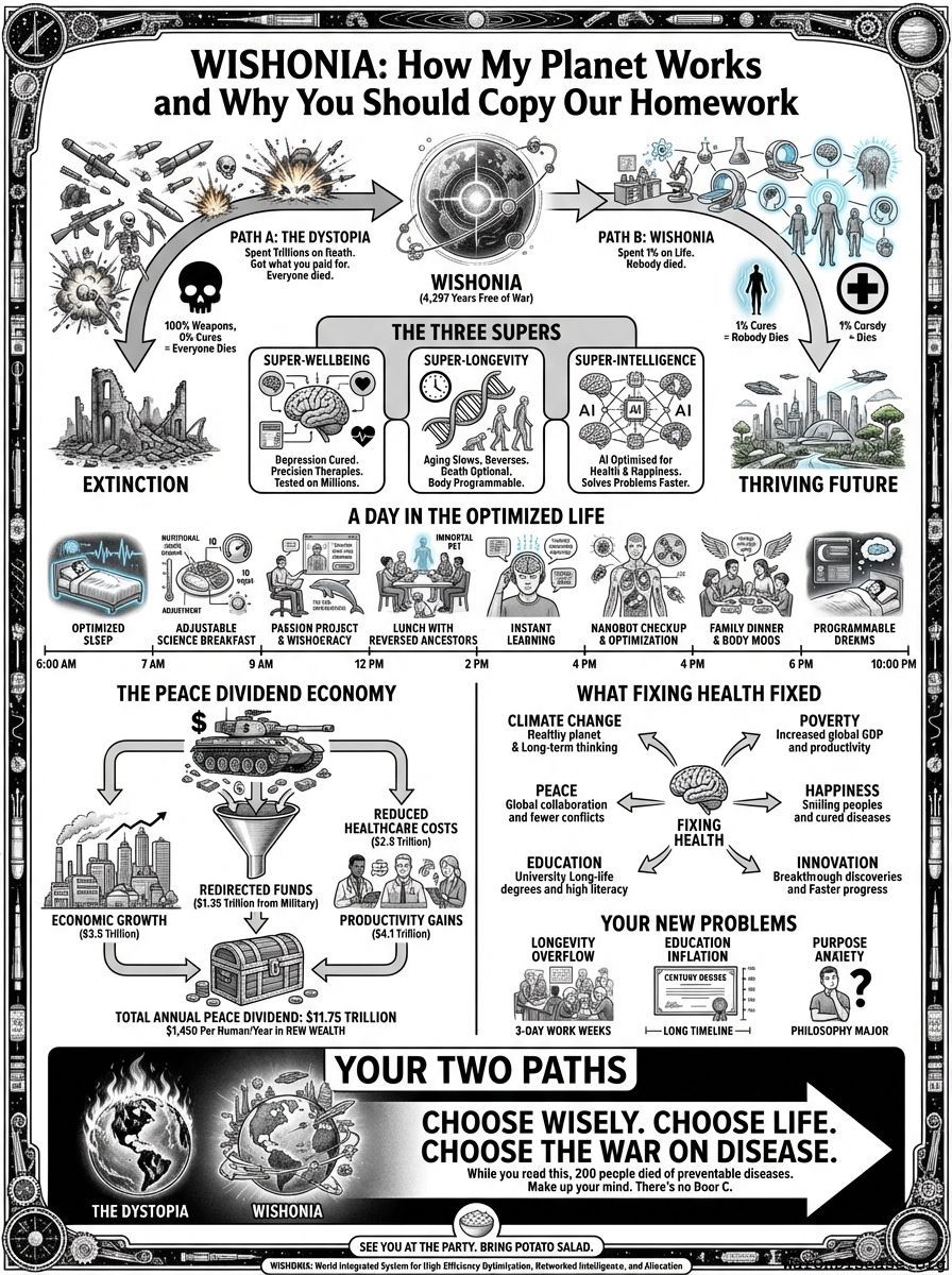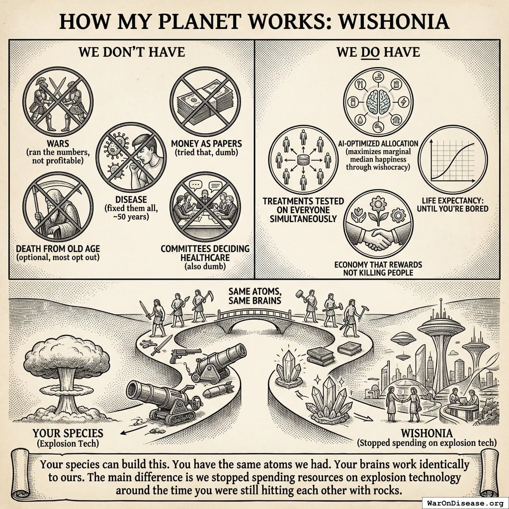 I’m from a planet also called Wishonia. We stopped having wars 4,297 years ago. Not because we evolved morally - we’re not that special. We just did the math and realized that dead citizens don’t pay taxes or invent things or have babies who grow up to pay more taxes.