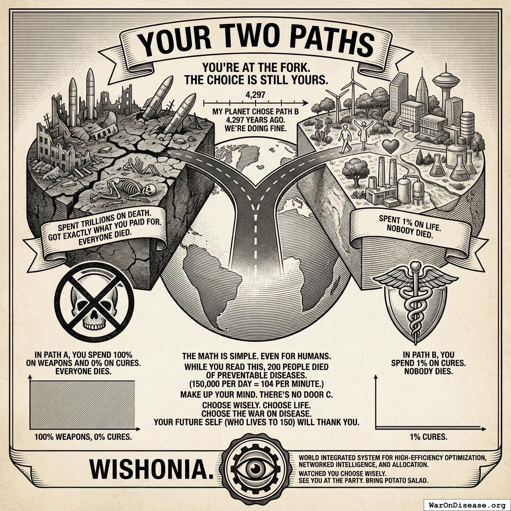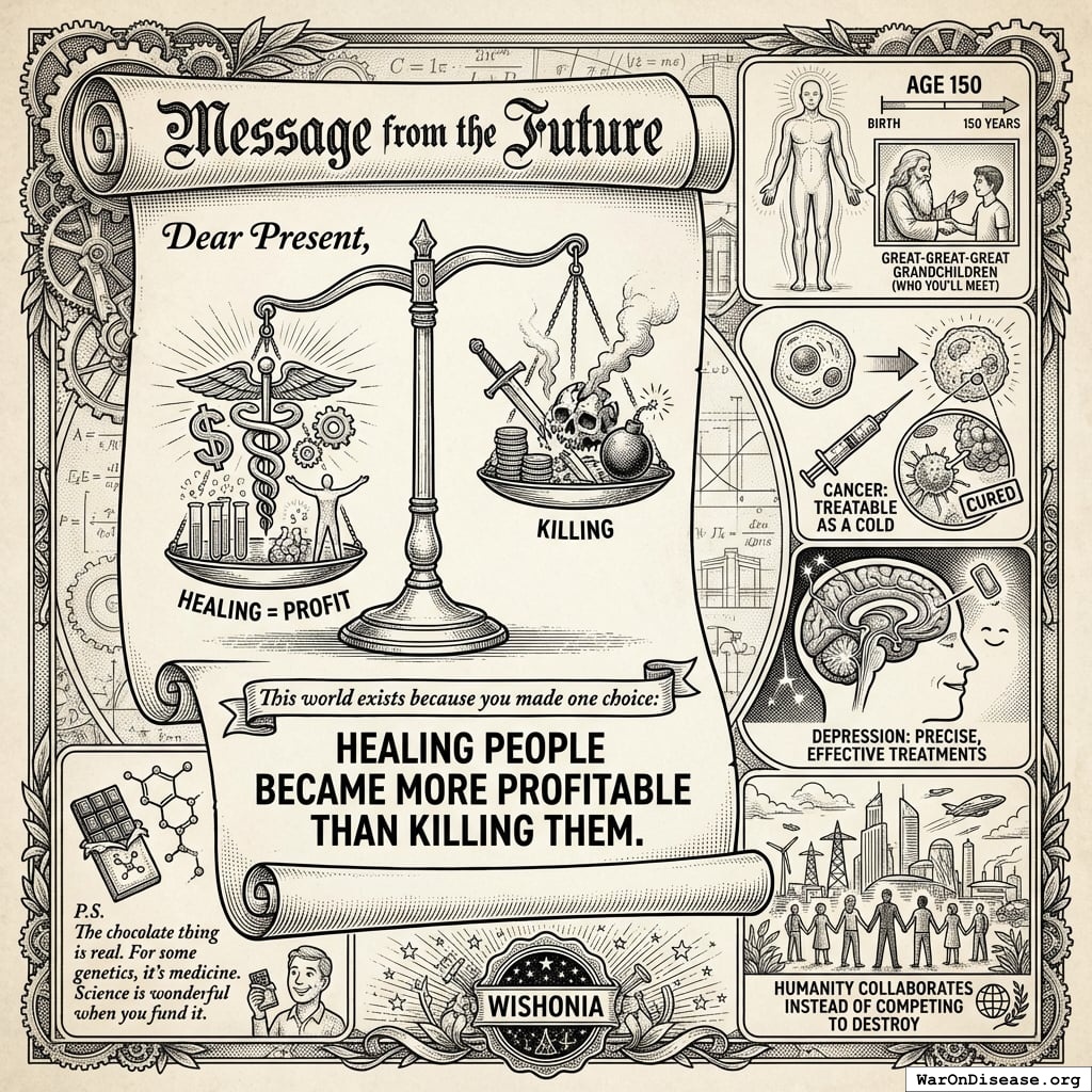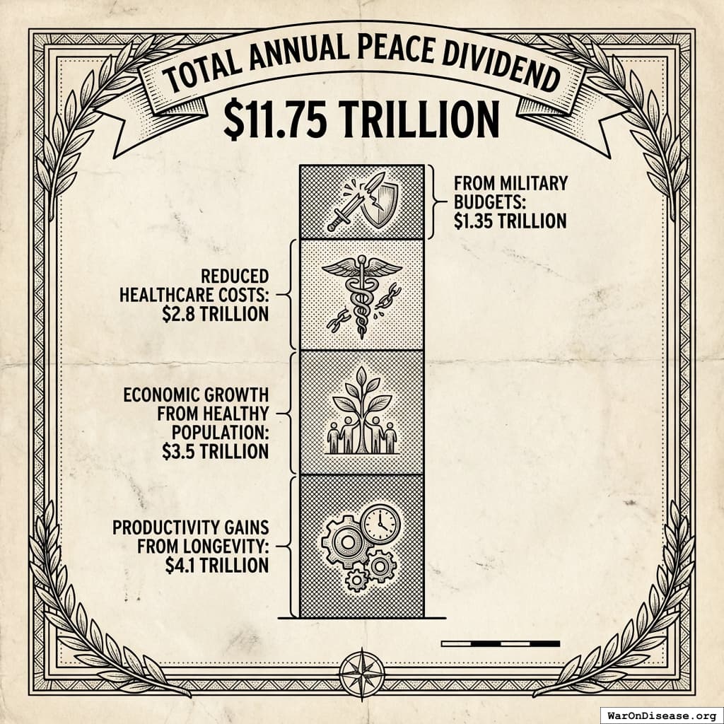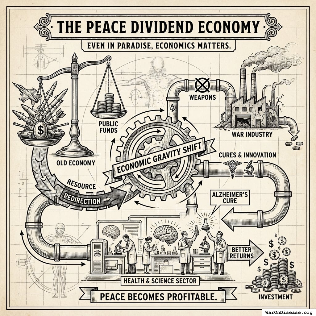 When resources redirect from weapons to cures, economic gravity shifts. Scientists and investors get better returns curing Alzheimer’s than building fighter jets. Peace becomes profitable.