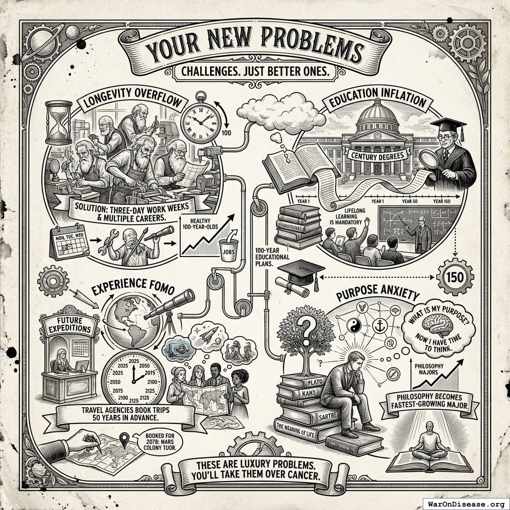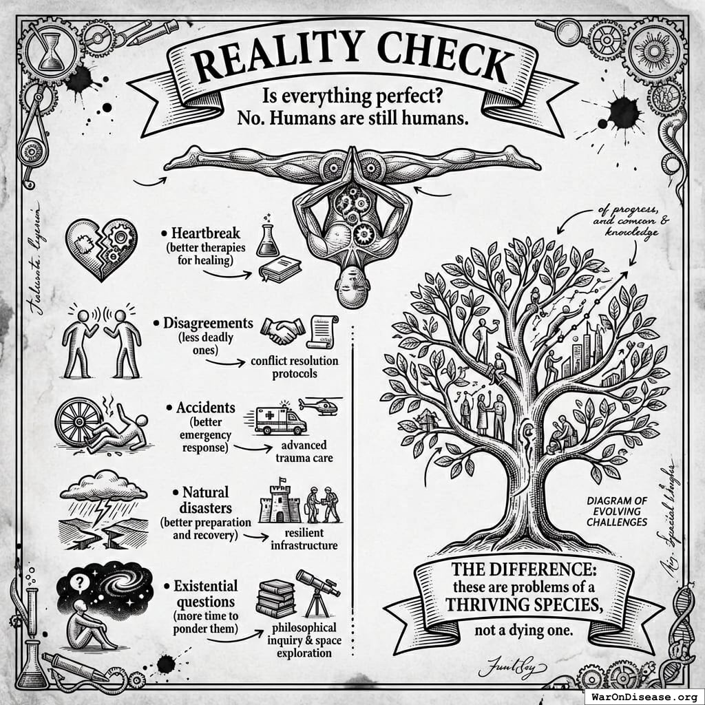 Death exists. You’re not immortal. But you die at 150 after a good life, not at 75 from something fixable.