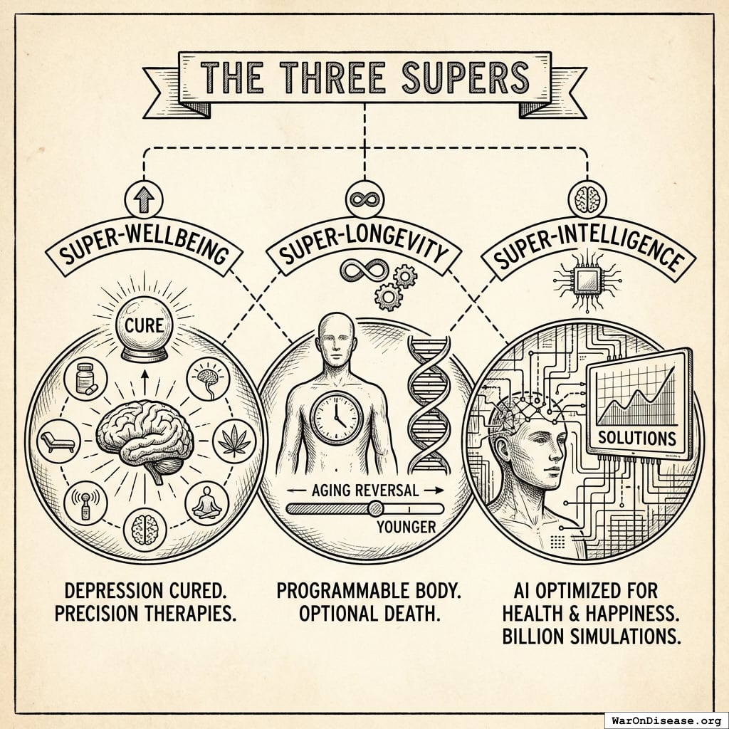 Super-Wellbeing: Depression gets cured. Not “managed.” Cured. Five different treatments, pick your favorite. Precision therapies that actually work because you tested them on millions of willing participants.