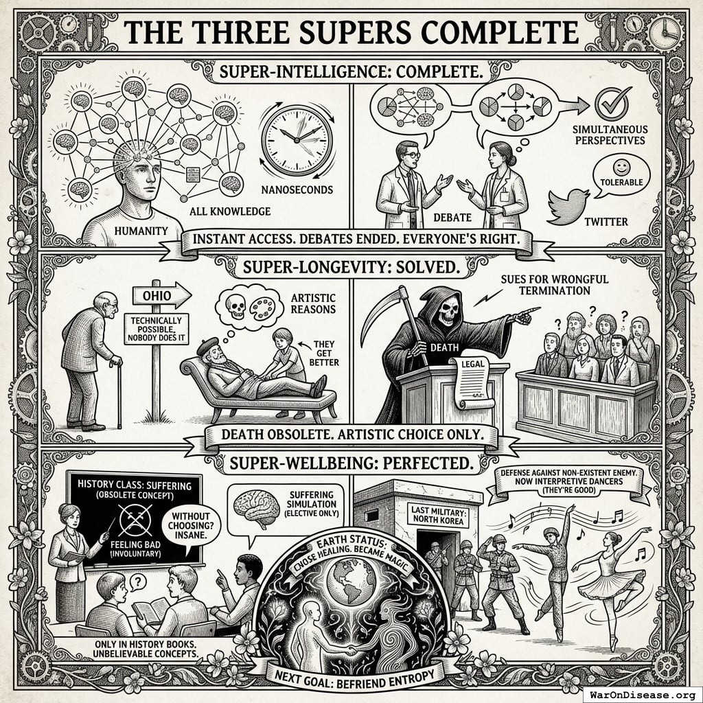 Super-Intelligence: Complete. Every human accesses all knowledge instantly. Debates end in nanoseconds. Everyone’s right about everything because you can simulate all perspectives simultaneously. Twitter becomes tolerable.