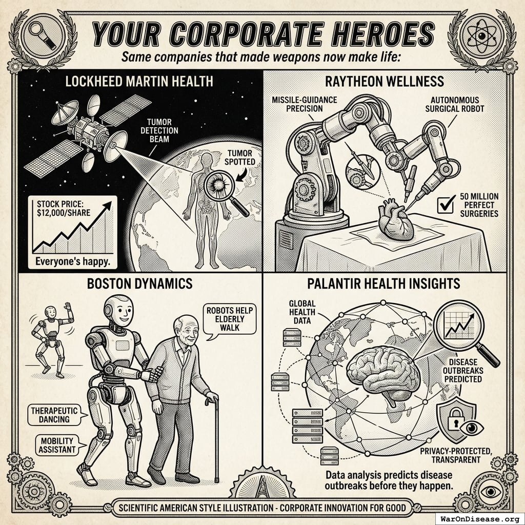 Lockheed Martin Health: Cancer-detecting satellites spot tumors from orbit. Stock price: $12,000/share. Everyone’s happy.