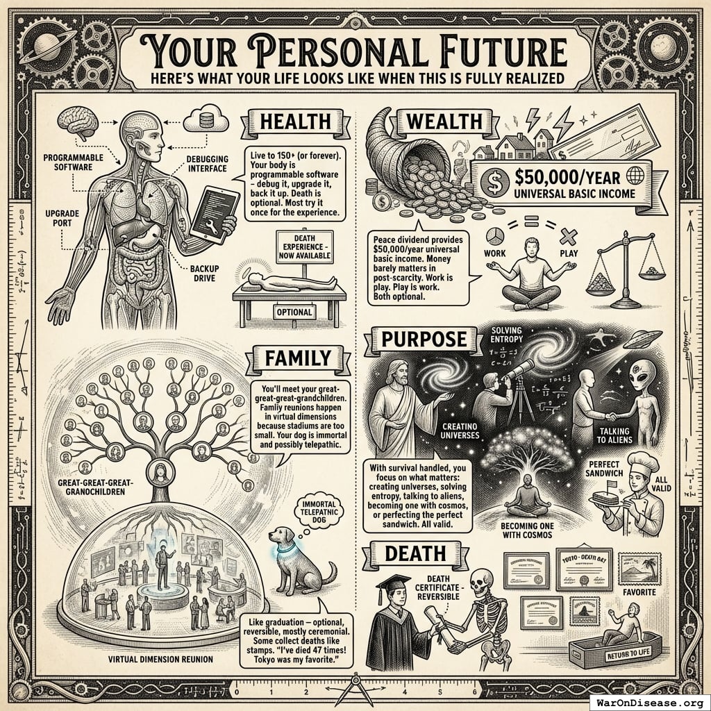 Health: Live to 150+ (or forever). Your body is programmable software - debug it, upgrade it, back it up. Death is optional. Most try it once for the experience.