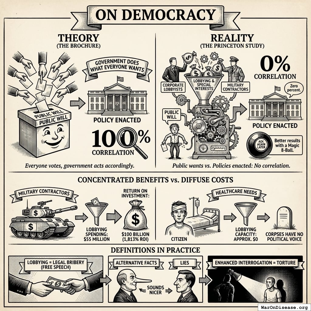 In reality, a Princeton study found 0% correlation between what the public wants and what policies get enacted. Zero percent. You’d get better results with a magic 8-ball.