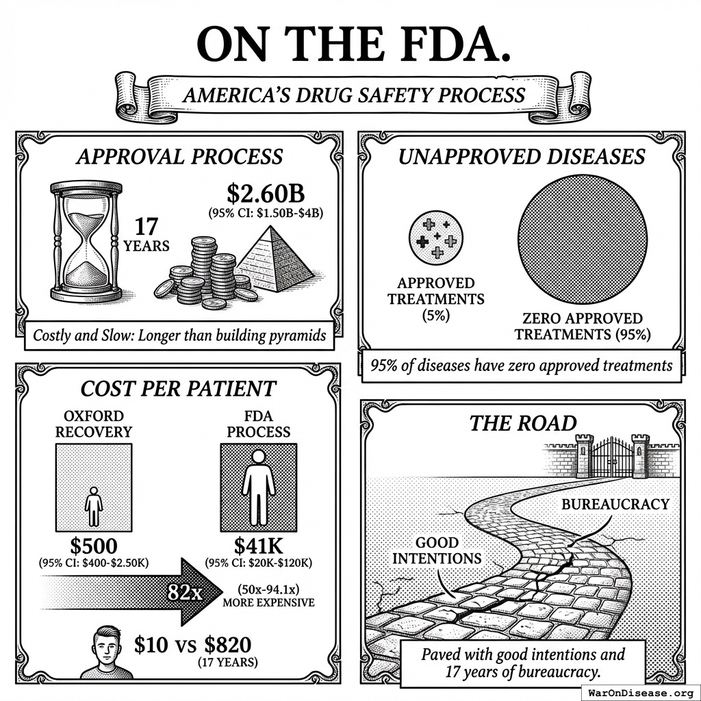 During the Oxford RECOVERY trial, they tested treatments on 40,000 patients for $500 (95% CI: $400-$2.50K) per person. The FDA’s process costs $41K (95% CI: $20K-$120K) per patient. That’s 82x (95% CI: 50x-94.1x) times more expensive for the same result, except slower. It’s like if you could get a haircut for $10 or $820, but the $820 haircut takes 14 years (95% CI: 12 years-17 years) and you might be bald by then anyway.