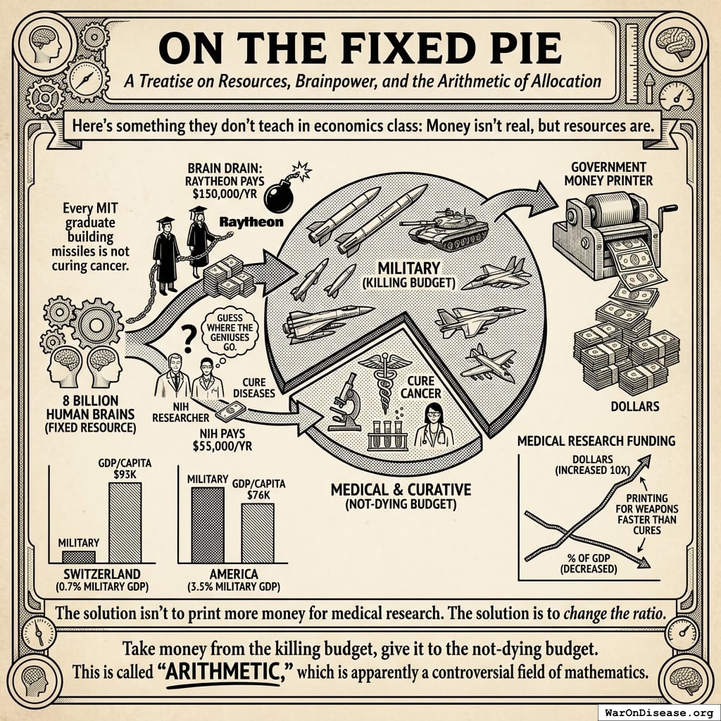 Earth has 8 billion human brains. You can’t print more brains. When the government prints money for military contractors, those contractors buy the smartest people. Every MIT graduate building missiles is not curing cancer.