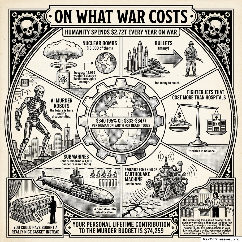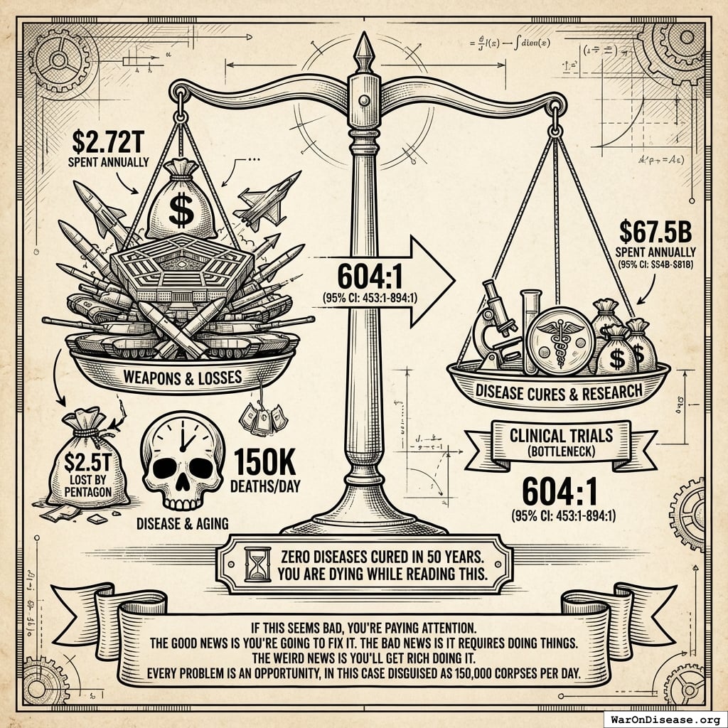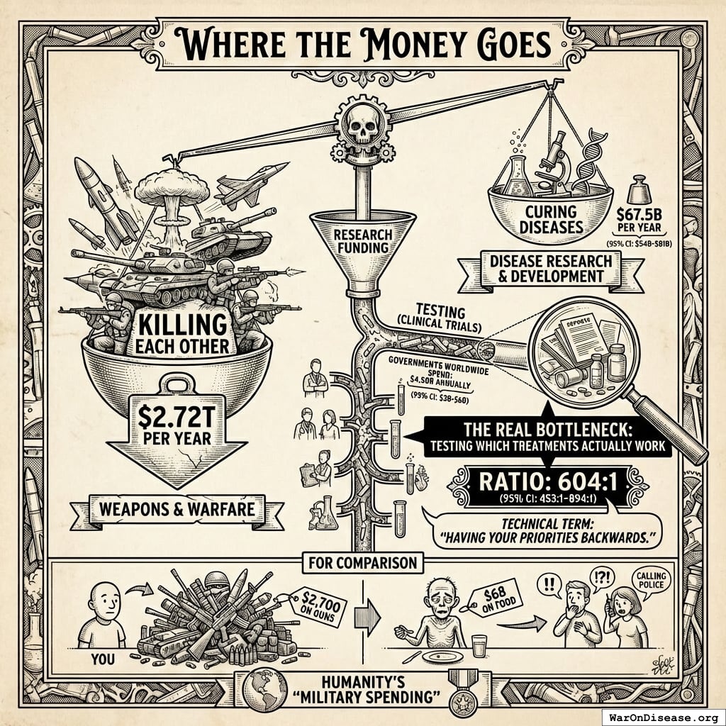 But the real bottleneck isn’t research funding. It’s testing which treatments actually work. Clinical trials determine whether medicines save lives or sit on shelves. On that front, governments worldwide spend $4.50B (95% CI: $3B-$6B) annually on clinical trials versus $2.72T on weapons. That’s a 604:1 (95% CI: 453:1-894:1) ratio, which in technical terms is called “having your priorities backwards.”