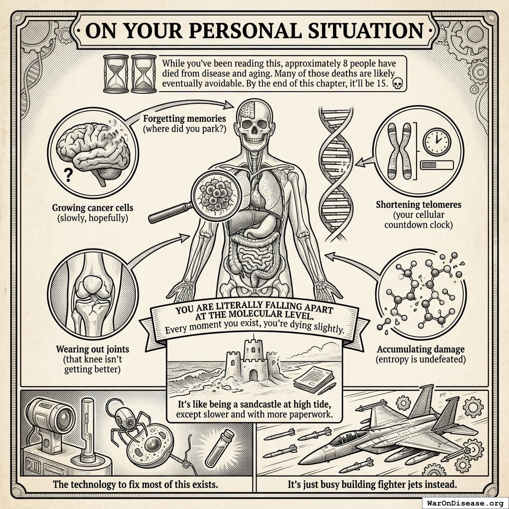 While you’ve been reading this, approximately 8 people have died from disease and aging. Many of those deaths are likely eventually avoidable. By the end of this chapter, it’ll be 15.