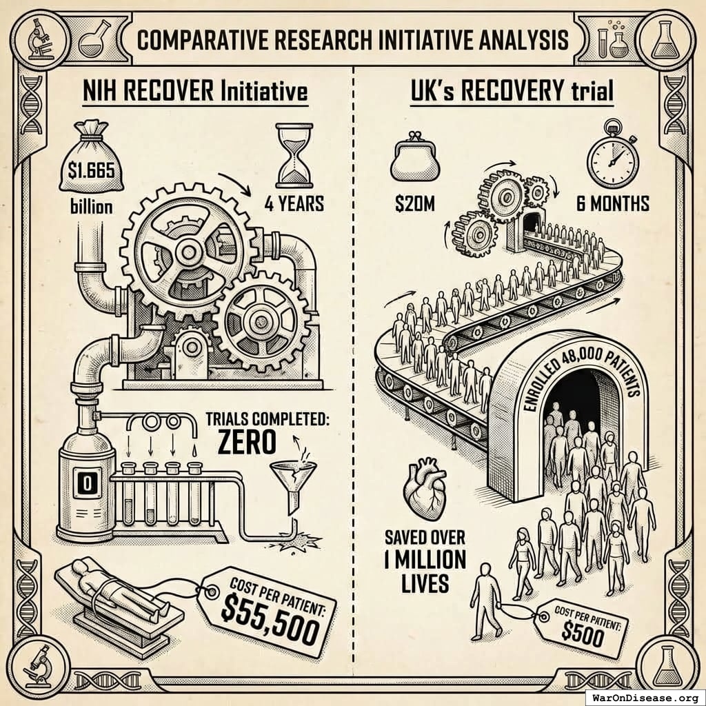 But it gets worse. The NIH RECOVER Initiative spent $1.665 billion over four years testing COVID treatments. Trials completed: zero. Cost per patient: $55,500.