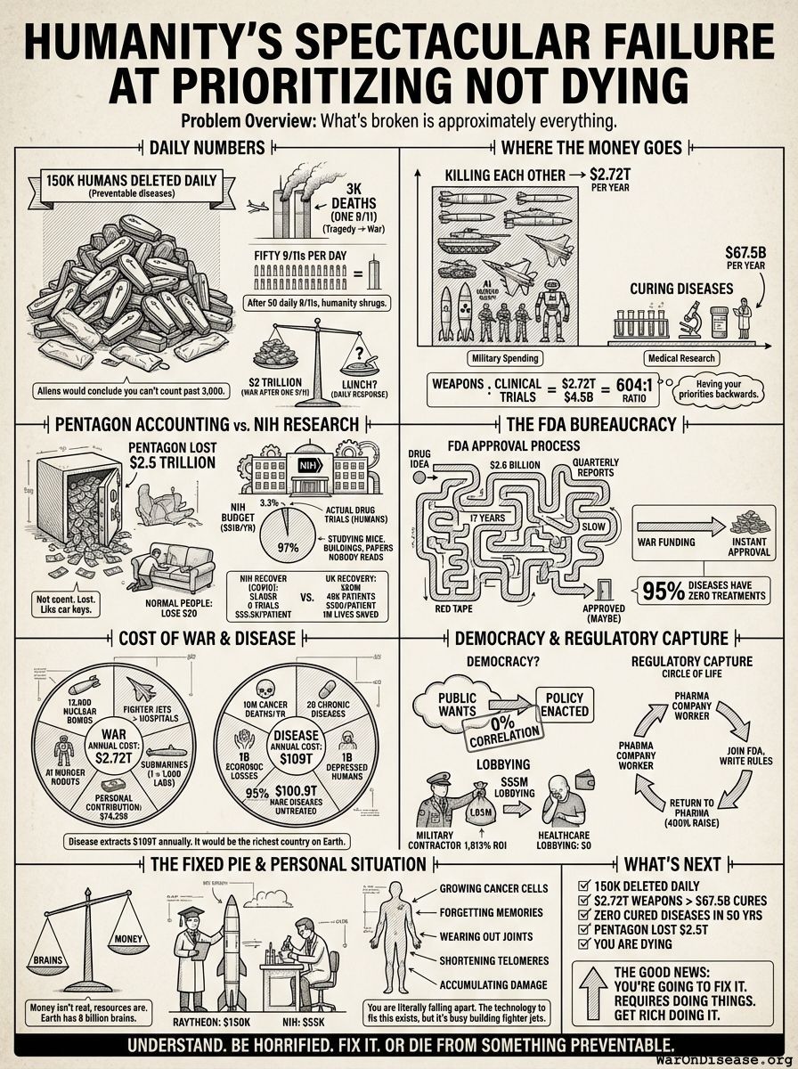 This inefficiency has a body count. The misallocation costs approximately 100 million quality-adjusted life-years annually. That’s 7 million death-equivalents per year from choosing the wrong research instead of the right research.
