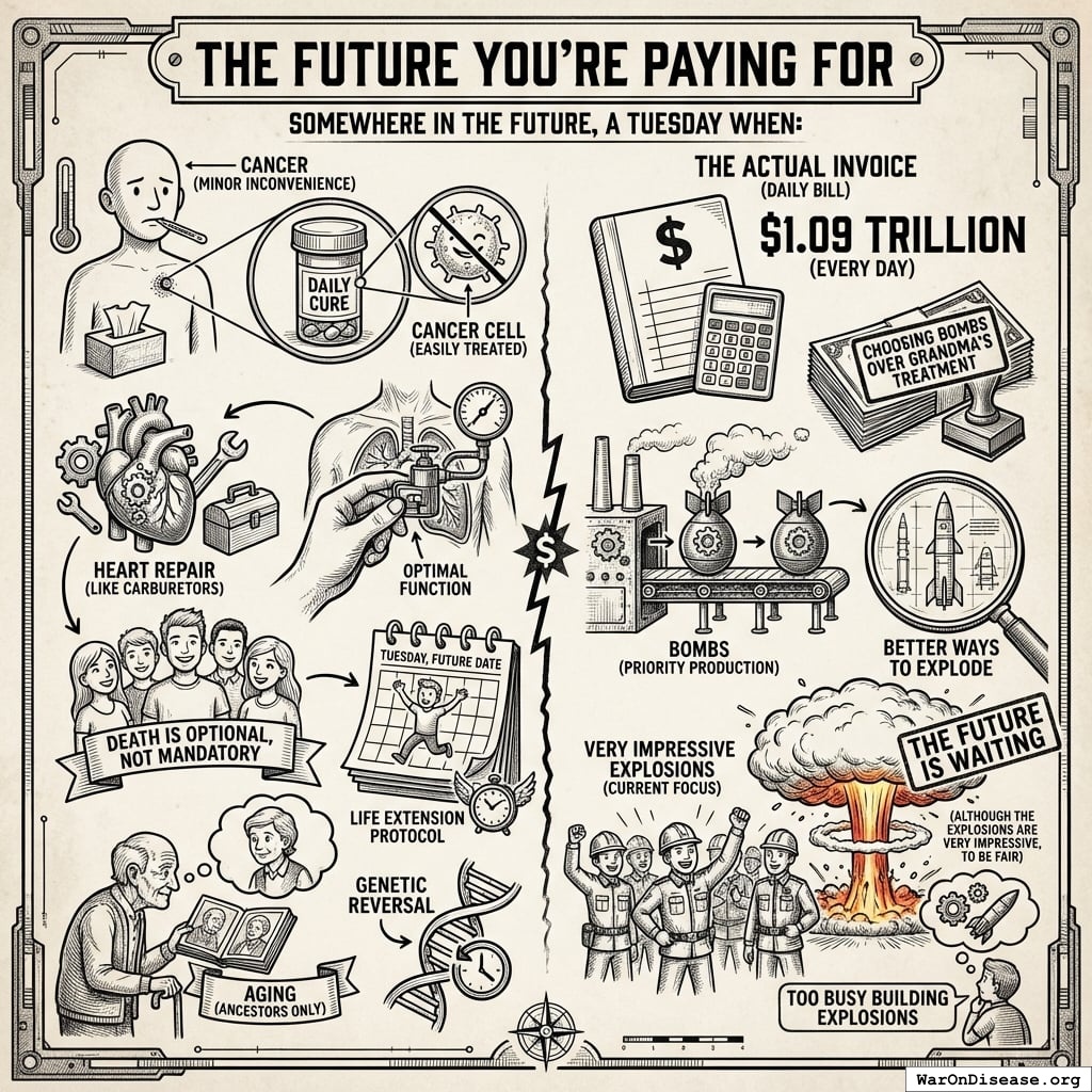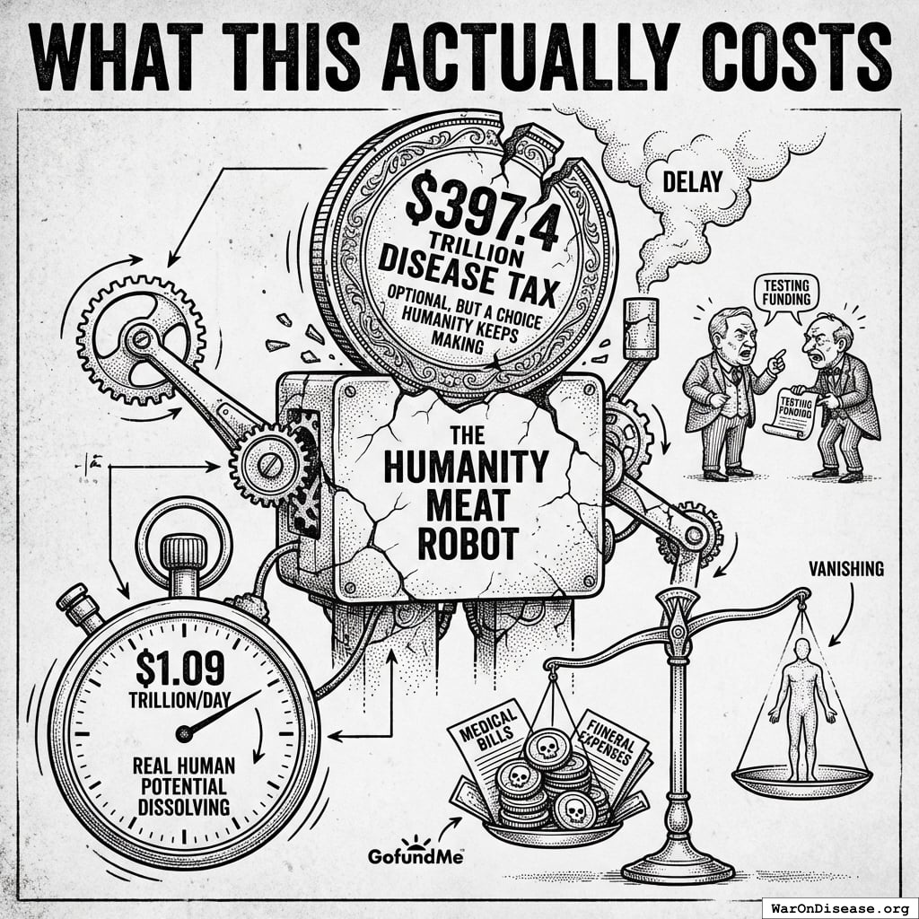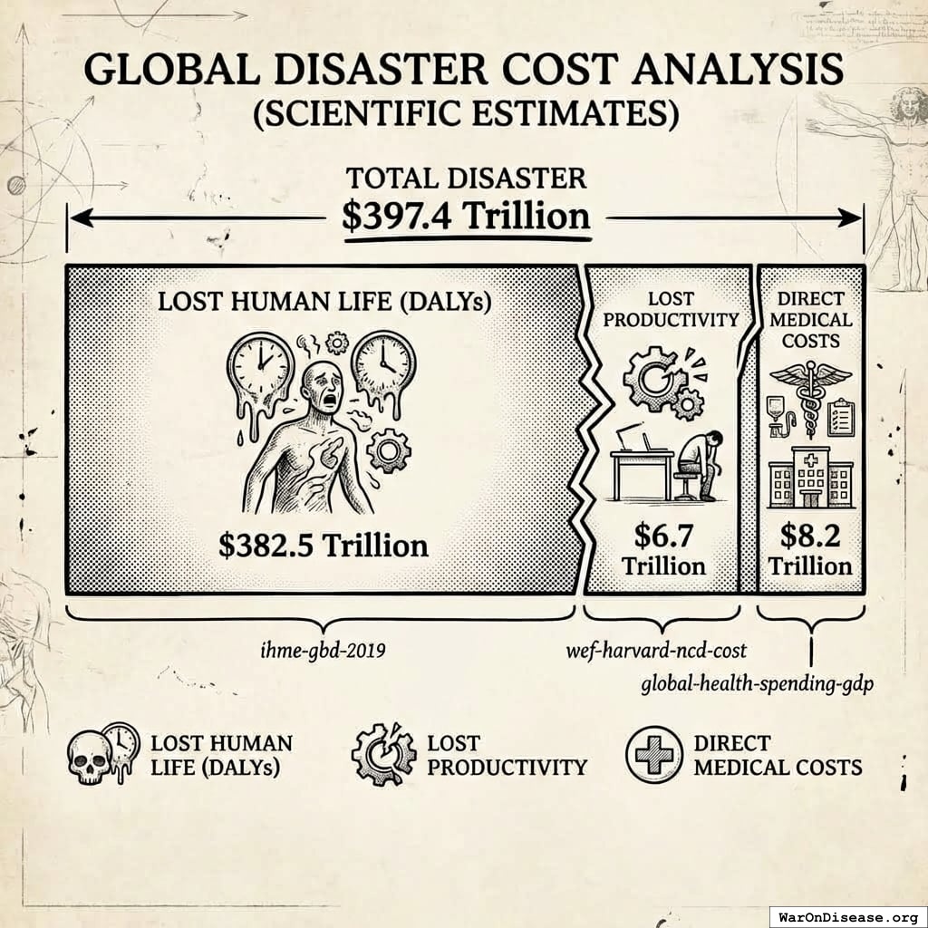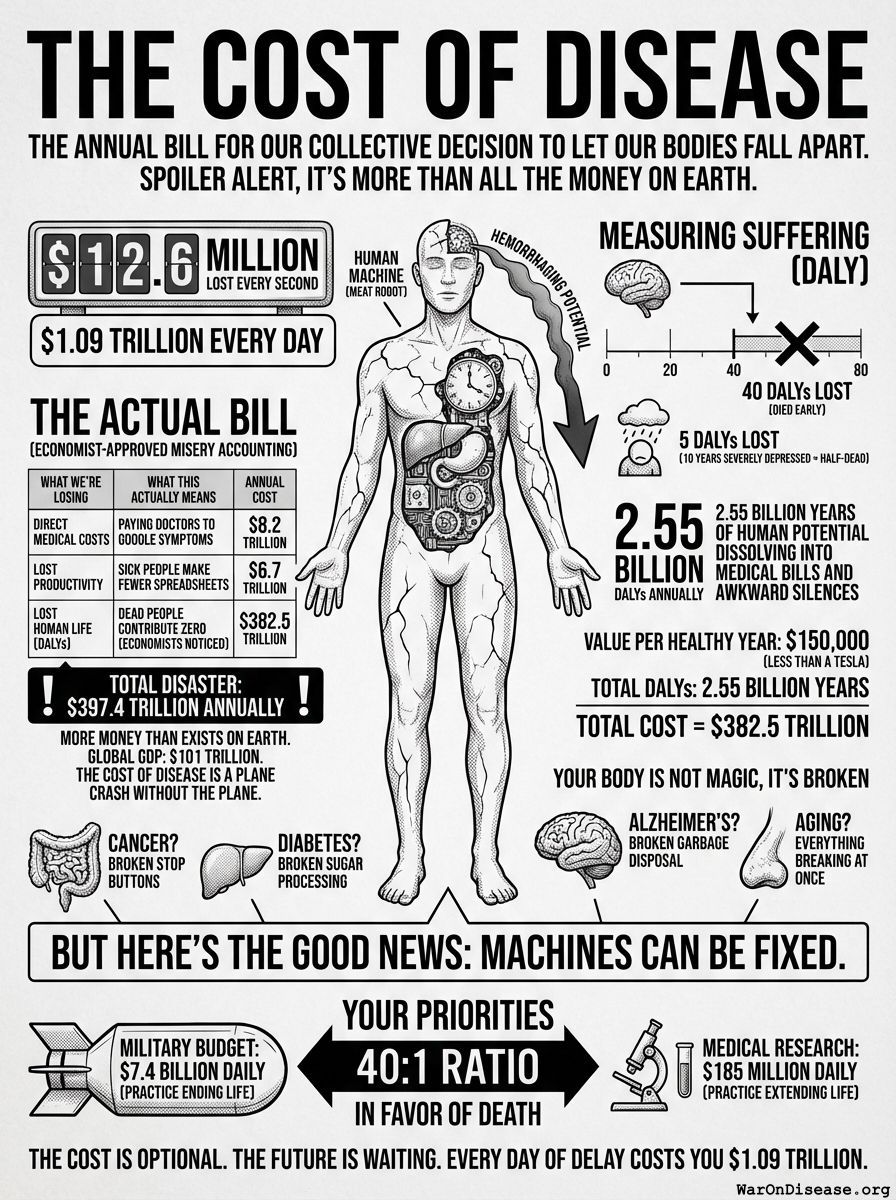 Humanity hemorrhages $397.4 trillion annually56 to diseases that are basically just engineering problems with meat robots.