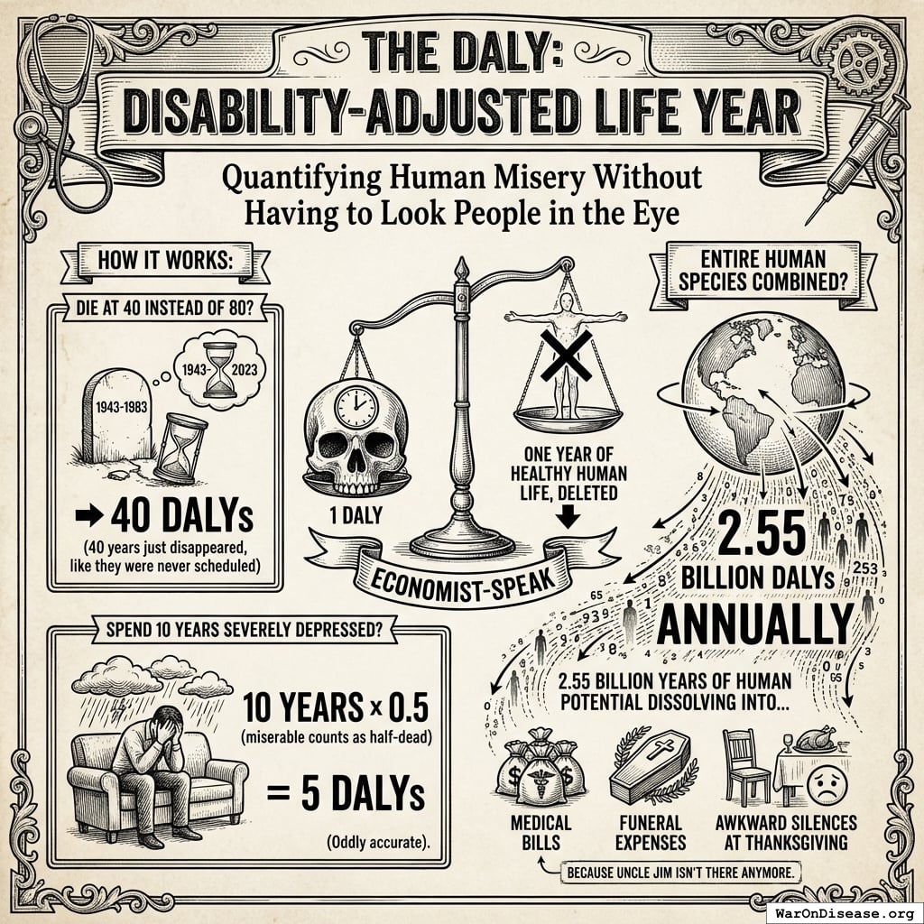 DALY stands for “Disability-Adjusted Life Year,” which is economist-speak for “quantifying human misery without having to look people in the eye.”