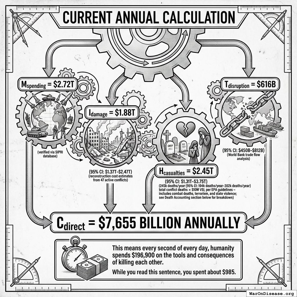 - Cconflict = Conflict zone premium (1.2-1.8×)