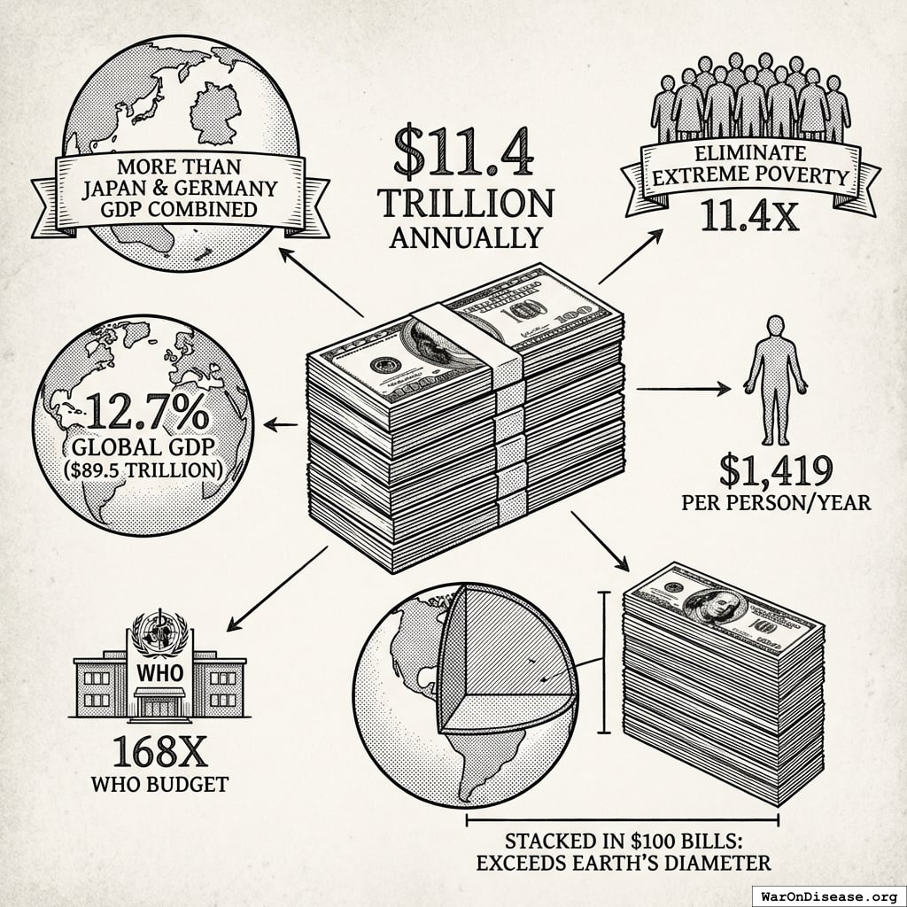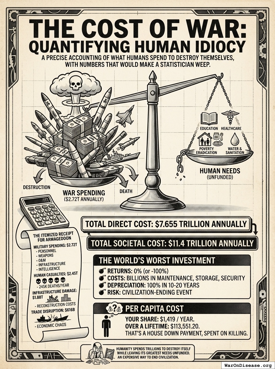 In 2024, humanity spent $2.72T on war. That’s not a typo. It’s the budget for your species’ most expensive and enduring hobby: organized violence. If you stacked that money in one-dollar bills, you could build a bridge two-thirds of the way to the Moon.