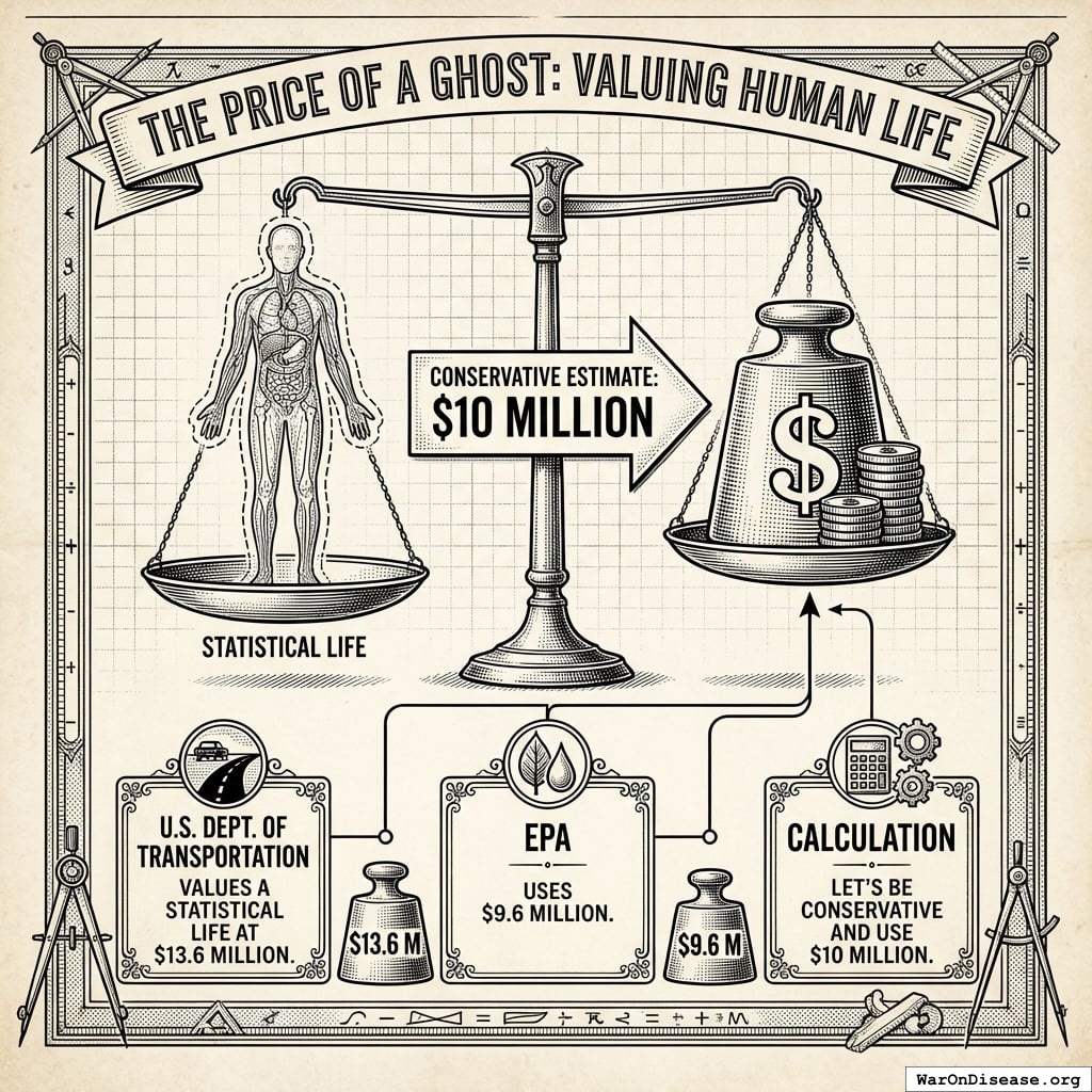 The U.S. Department of Transportation values a statistical life at $13.6 million133. The EPA uses $9.6 million142. Let’s be conservative and use $10 million.