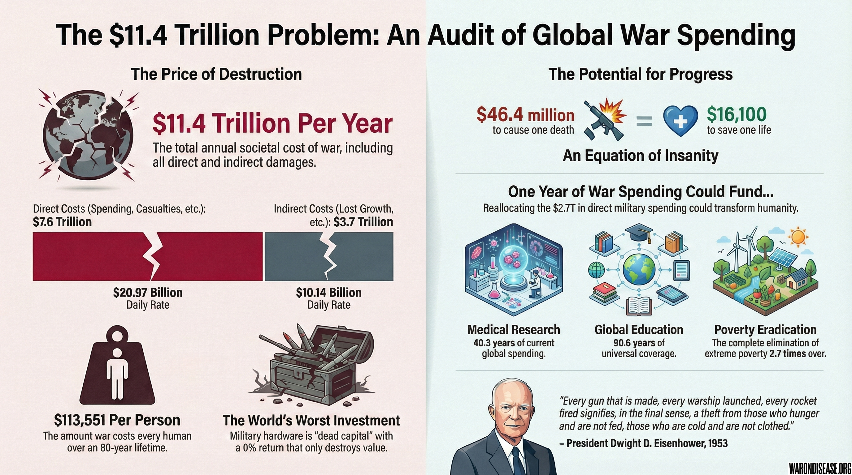 \[ \begin{aligned} \text{Efficiency}_{\text{war}} &= \text{Deaths}_{\text{produced}} \div \text{Dollars}_{\text{spent}} \\ &= 244,600 \div \$11.4\text{T} \\ &= 0.000021 \text{ deaths per dollar} \end{aligned} \]