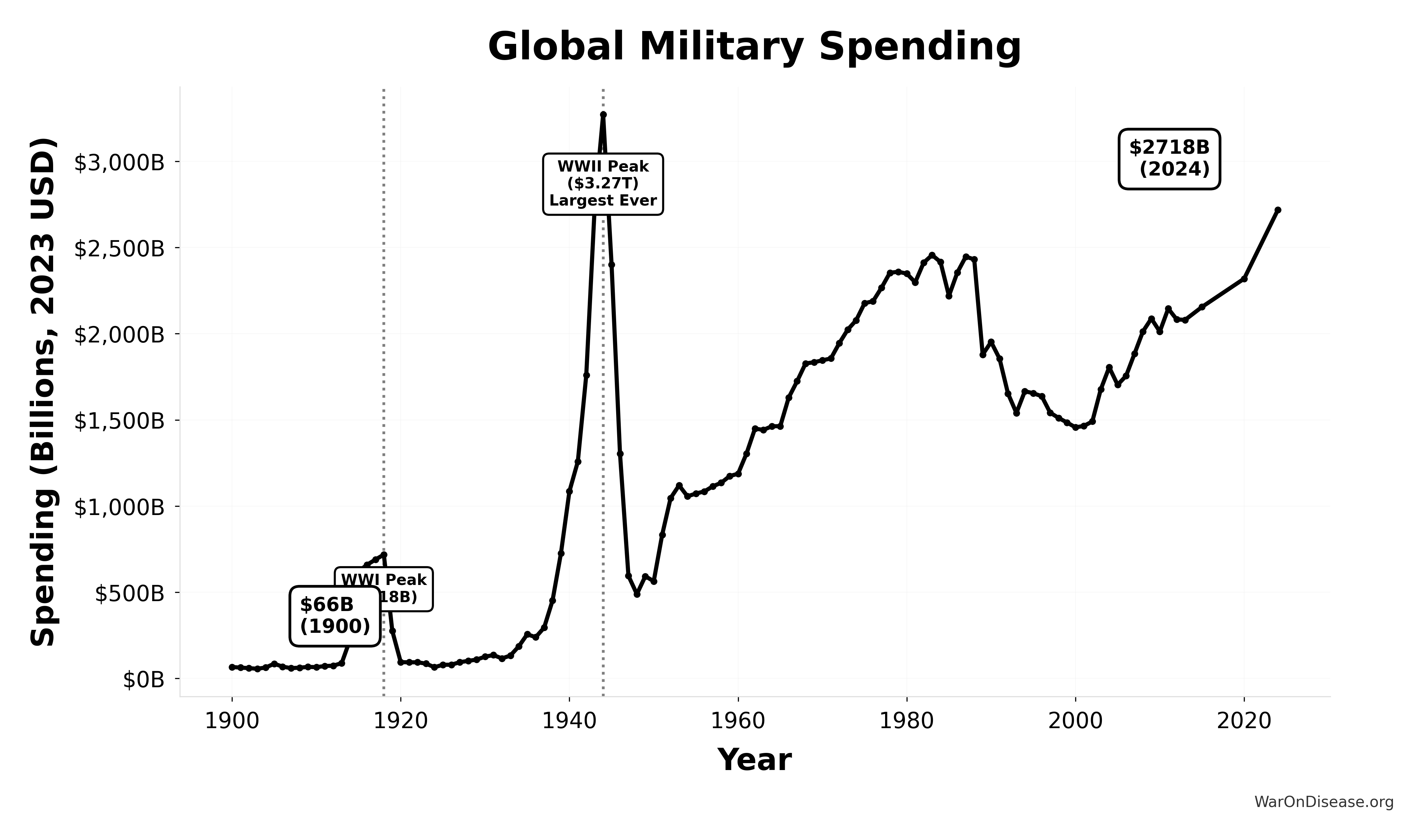 Key Insight: Despite decades of peace and the absence of total global war, current military spending ($2.72T) is 83% of the WWII peak and 41× higher than pre-WWI levels ($66B in 1900). The world spends nearly as much on military today as it did during the largest war in history.