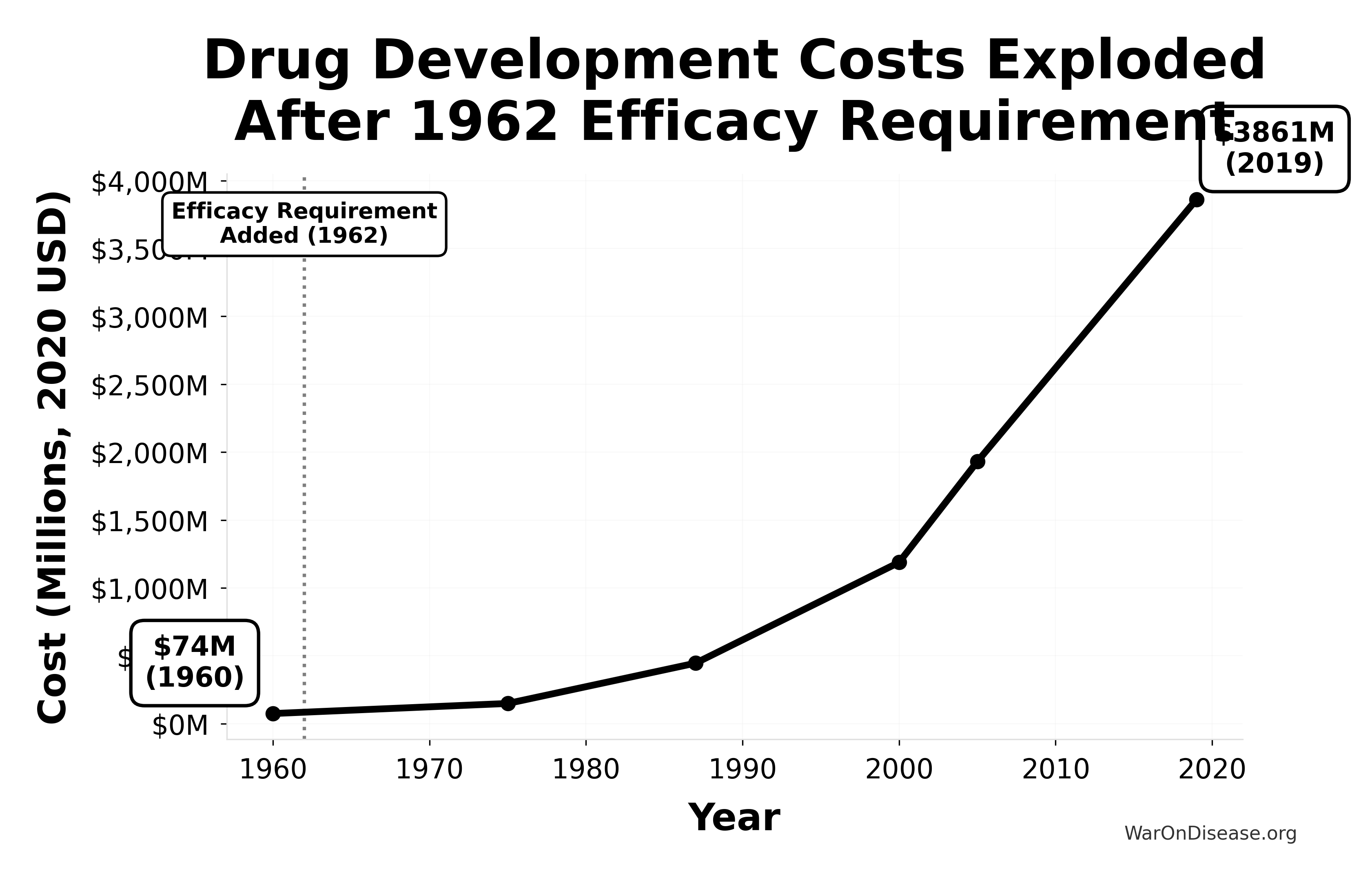 Key Insight: Drug development costs were relatively stable before 1962, then exploded exponentially after the efficacy requirement was added. Costs increased 52x from $74M (1960) to $3,861M (2019), making innovation increasingly expensive and inaccessible.
