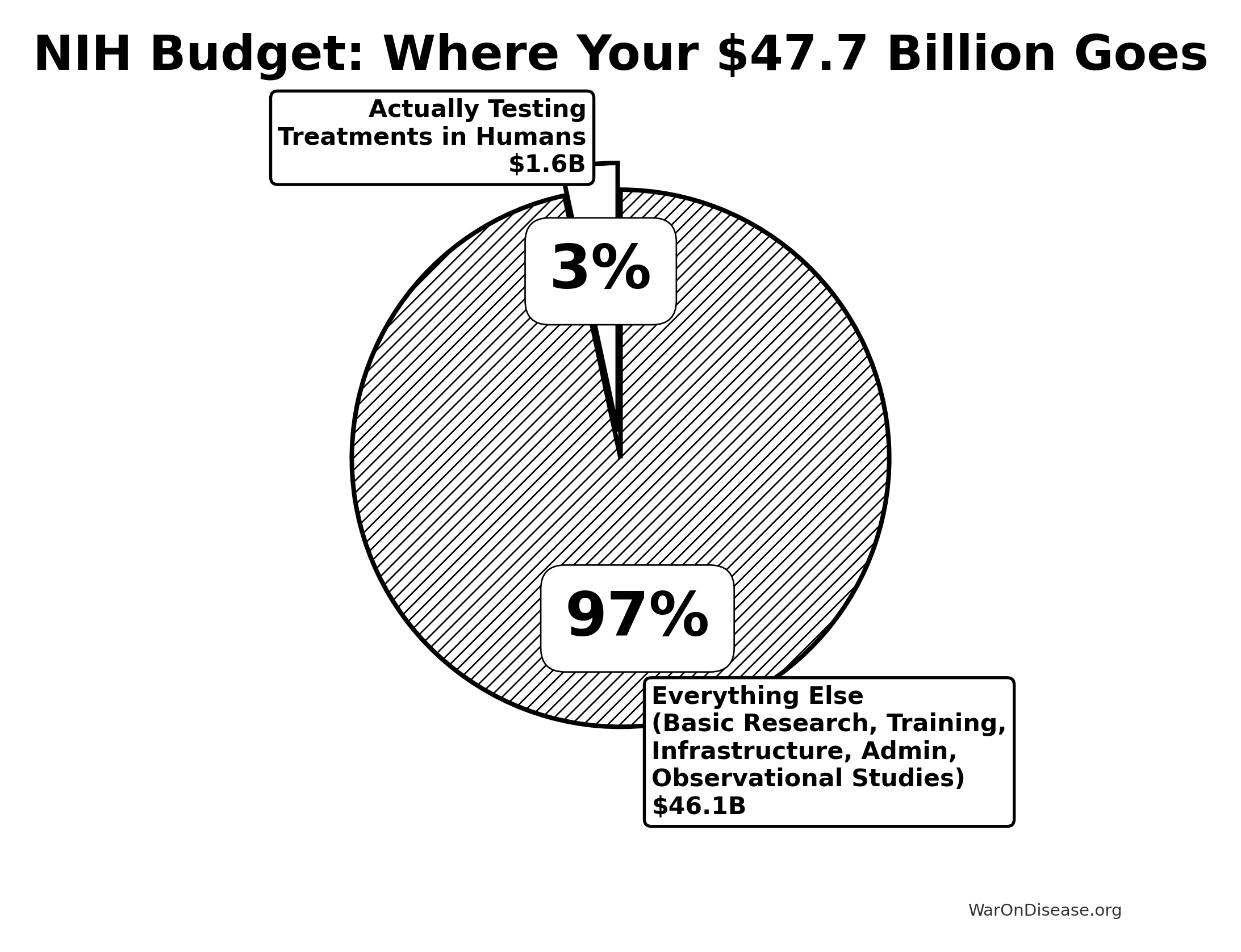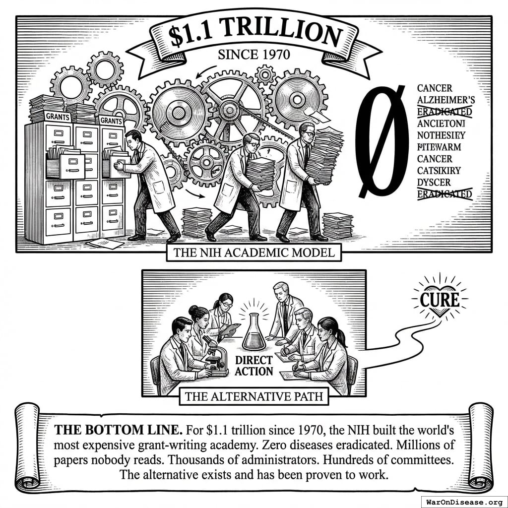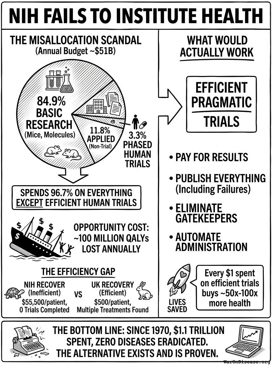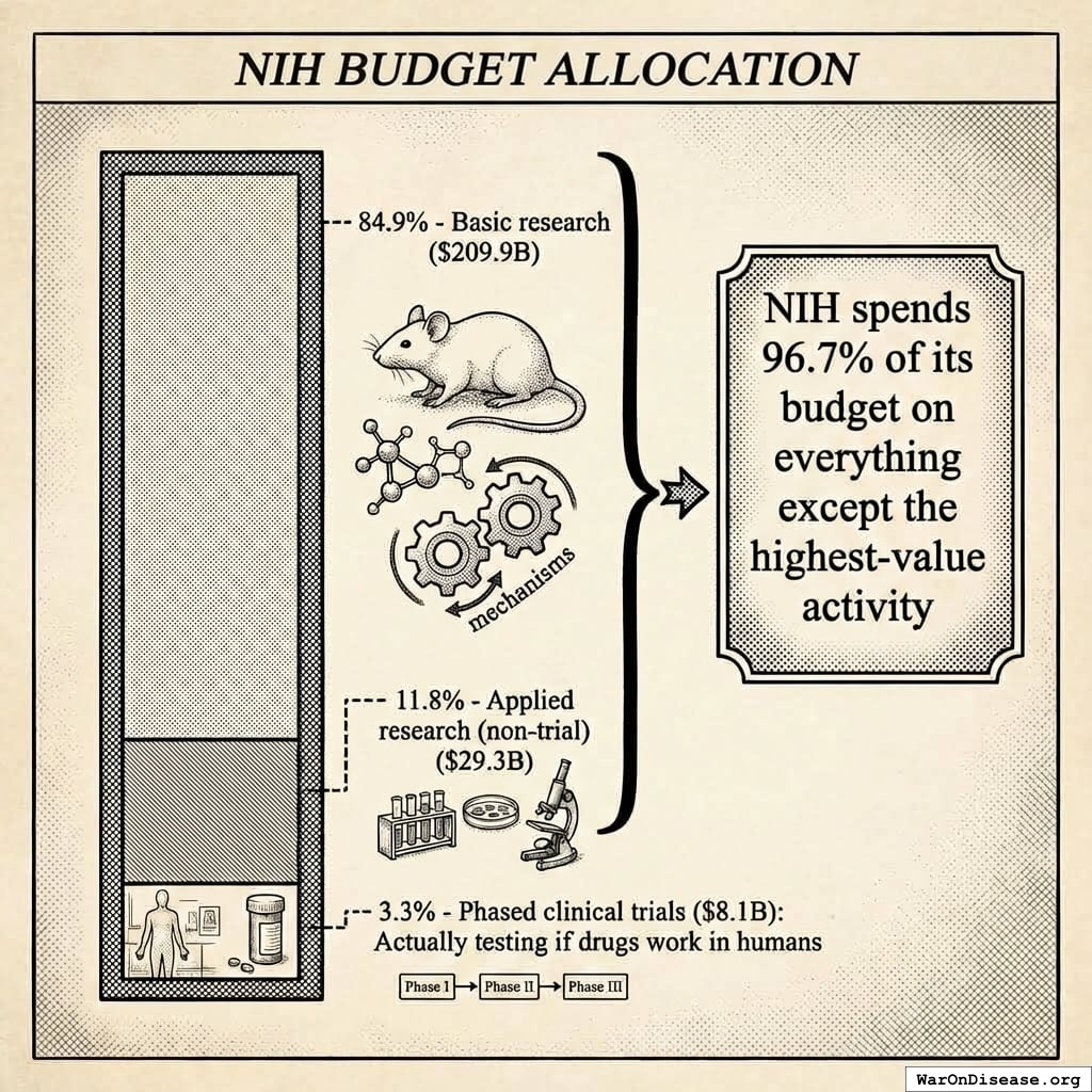 The NIH spends 96.7% of its budget on everything except the highest-value activity: running efficient clinical trials in humans.