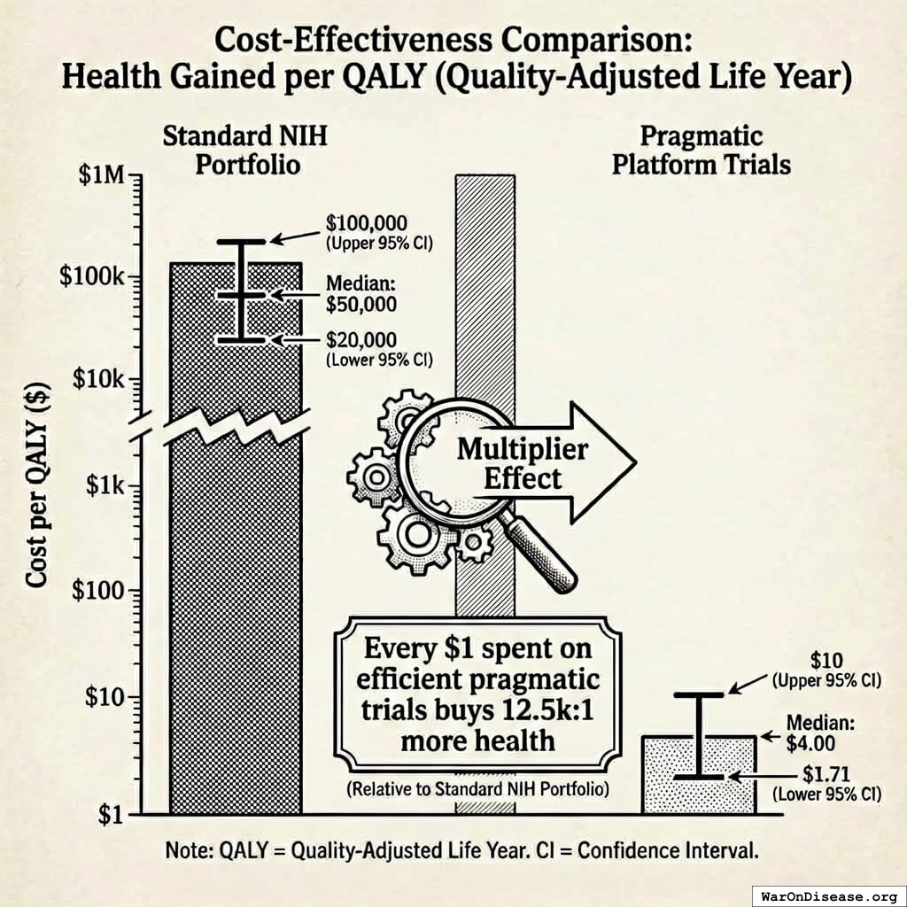 The NIH isn’t just inefficient. By blocking the shift to high-efficiency trial platforms, the current budget allocation is actively destroying the equivalent of millions of lives annually compared to the optimal allocation.