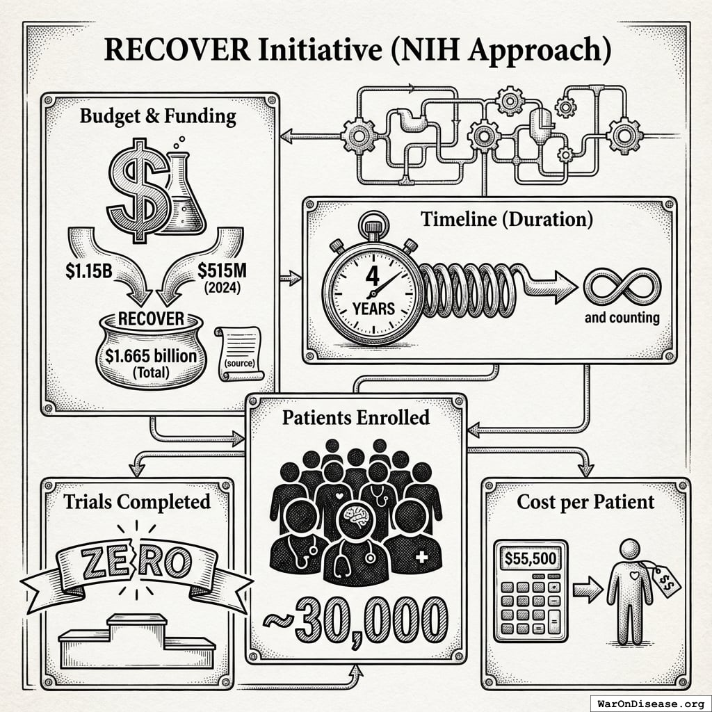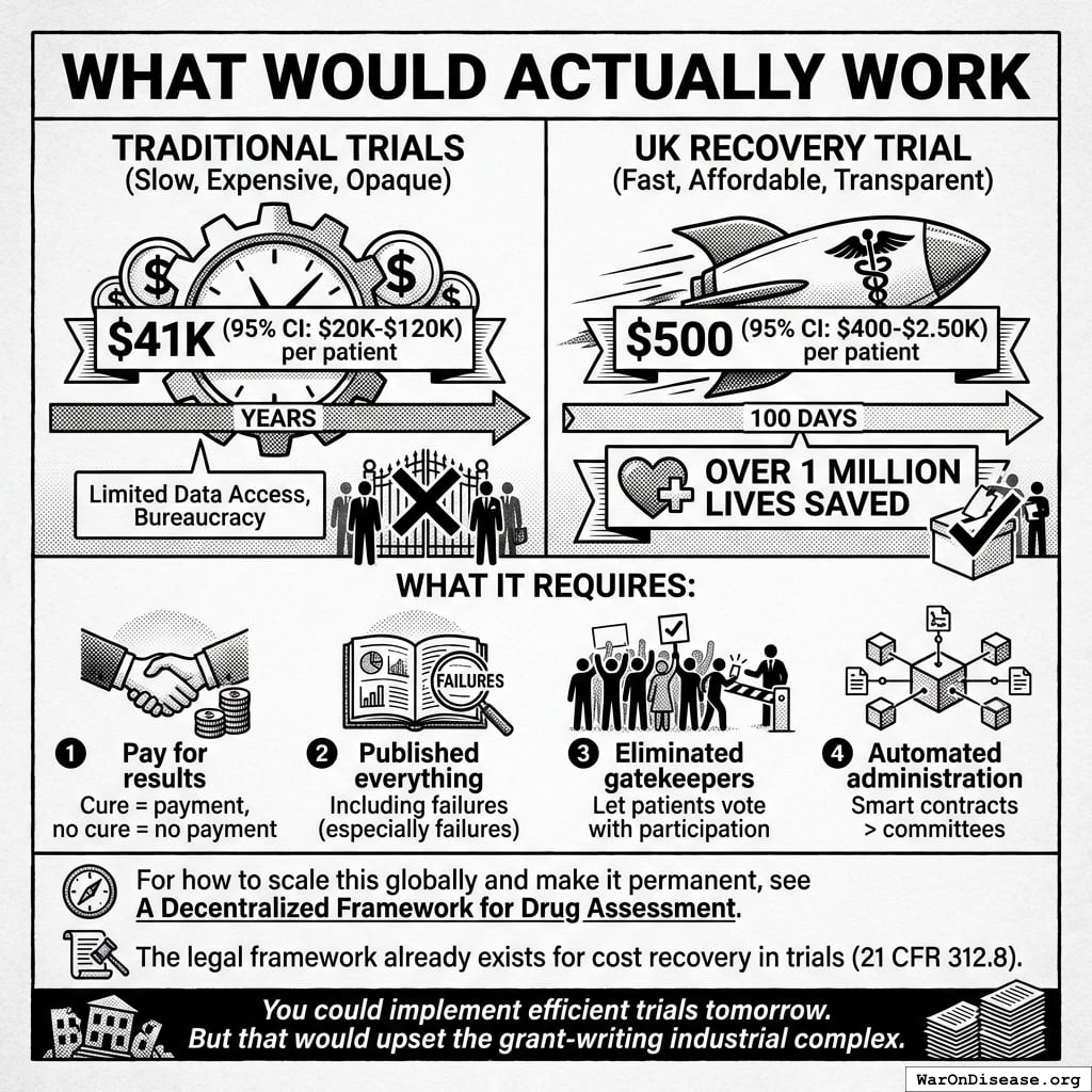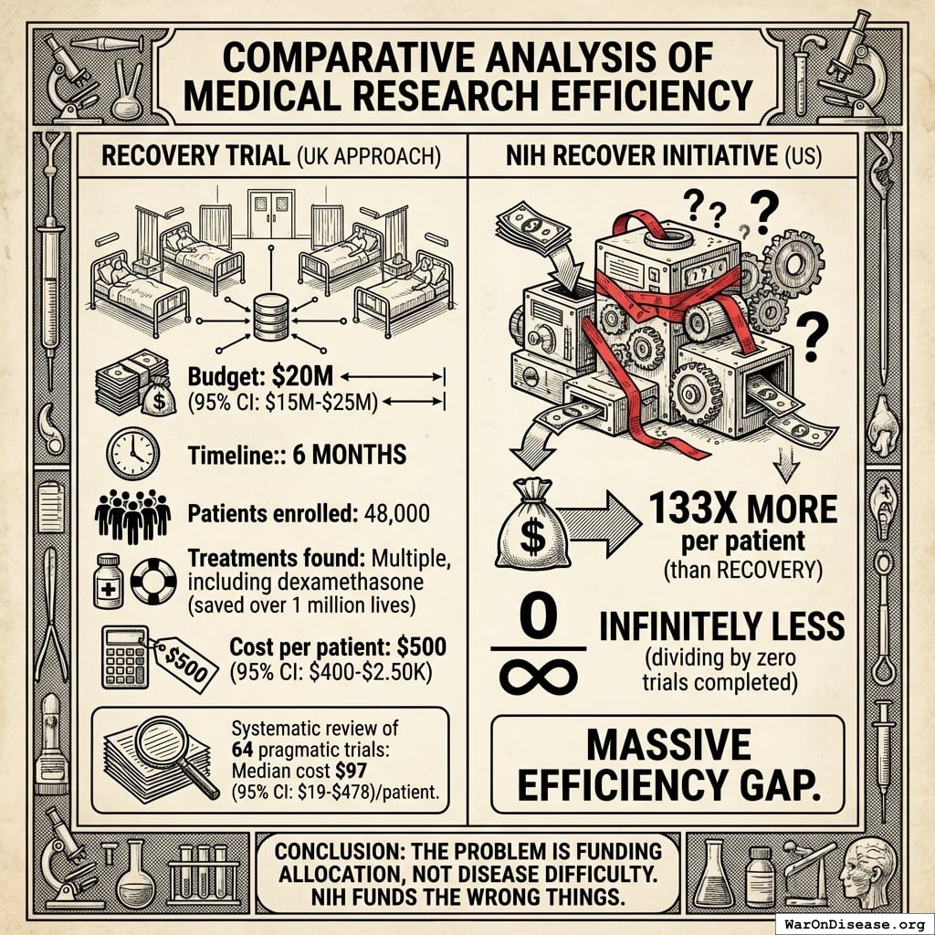 The NIH RECOVER Initiative spent 133X more per patient to achieve infinitely less (dividing by zero trials completed). This massive efficiency gap is not unique to RECOVERY; a systematic review of 64 pragmatic trials found a median cost of $97 (95% CI: $19-$478)/patient85.