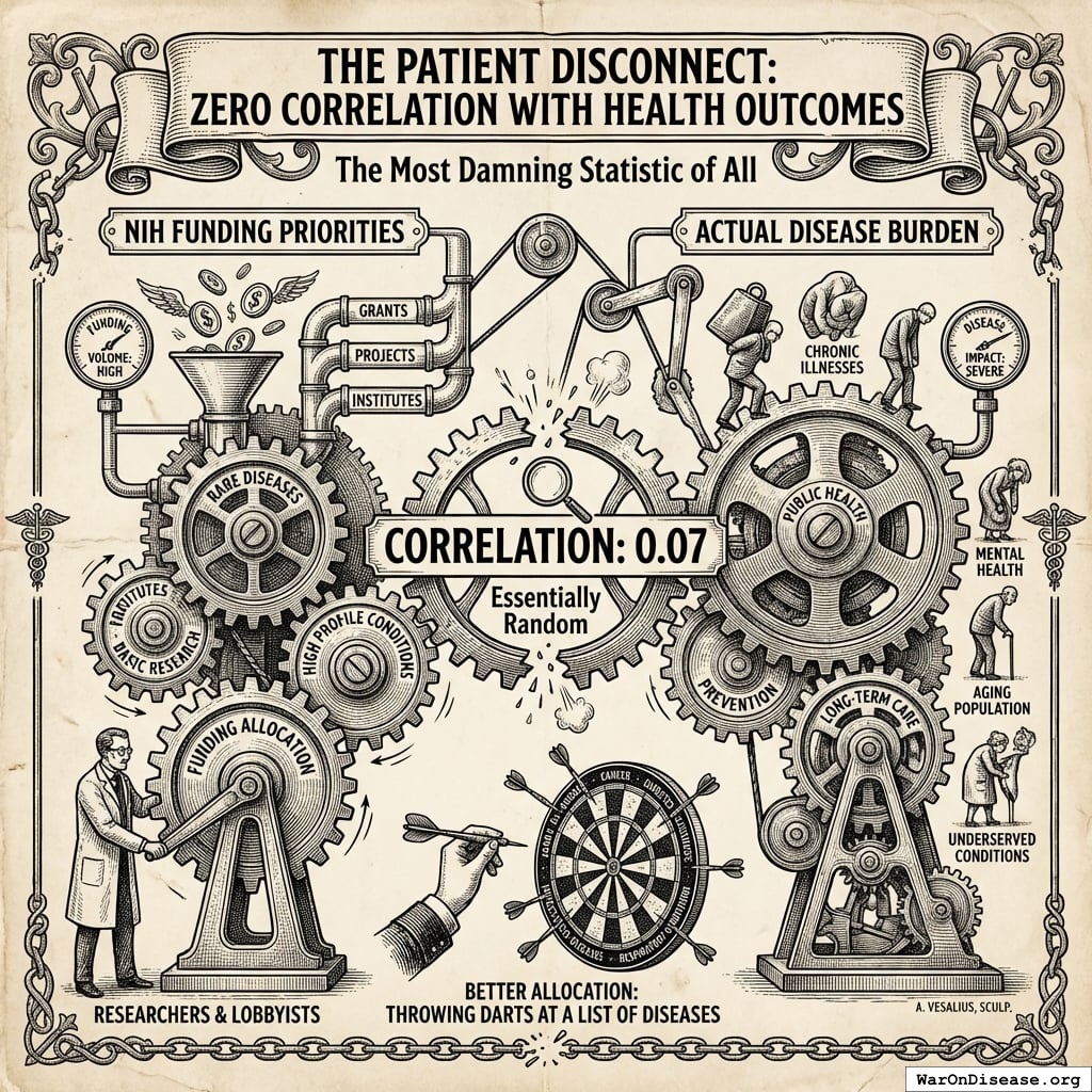 ScienceDirect: Persistence of Very Low Correlations https://www.sciencedirect.com/science/article/pii/S2666535224001174 Very weak correlations: R² < 0.03 between NIH funding and 5 disease burden measures for 27 diseases Historical (1996): r=0.62 correlation with DALYs, but explained only 39% of variance Recent (2008-2019): Simple correlation 0.08 between disease burden increases and funding increases 2019 analysis: Only 29% of variance in NIH funding explained by disease burden Strongest predictor of 2019 funding: 2008 funding levels (r=0.88), revealing long-standing inefficiencies Additional sources: https://www.sciencedirect.com/science/article/pii/S2666535224001174 | https://www.nejm.org/doi/full/10.1056/NEJM199906173402406 | https://pmc.ncbi.nlm.nih.gov/articles/PMC3044706/