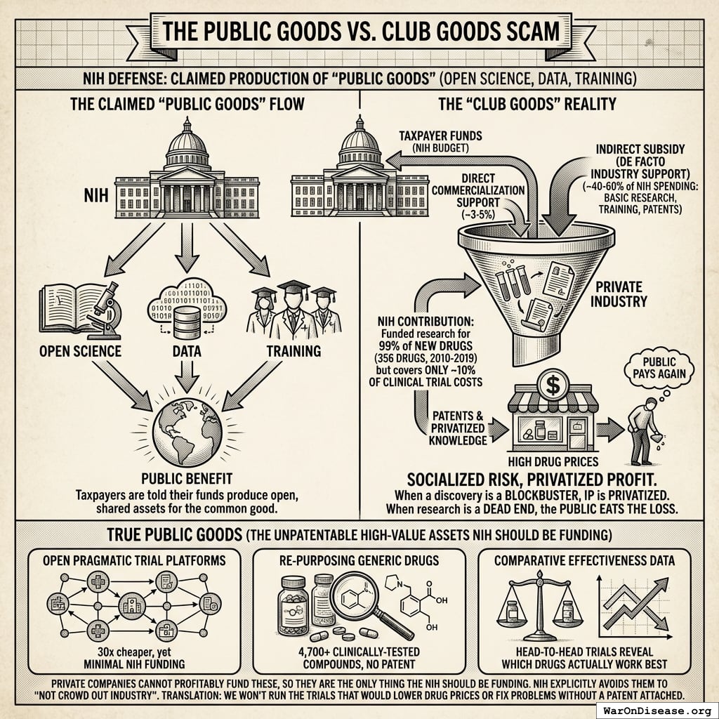 The NIH defends its existence by claiming to produce “Public Goods” (open science, data, training). In reality, it spends taxpayers’ money to produce “Club Goods” for private industry.