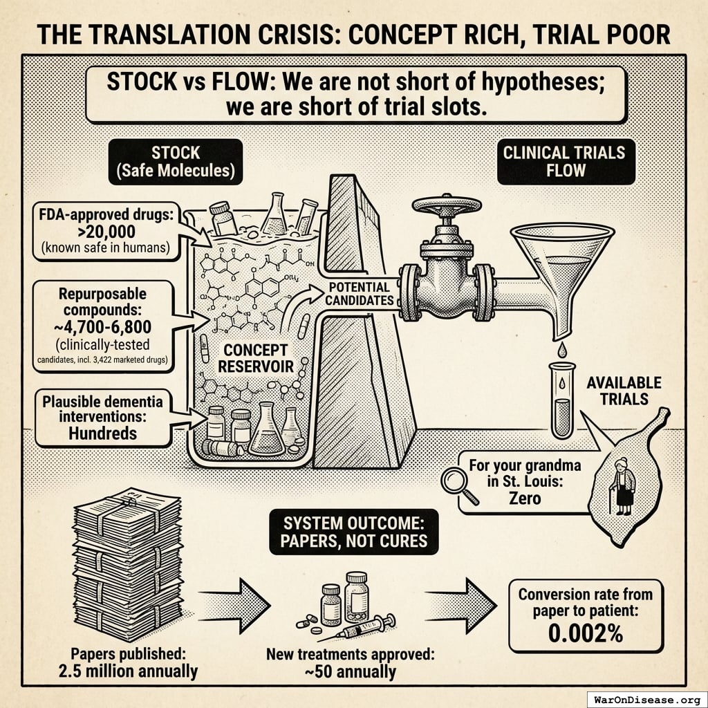 We have a massive stock of safe molecules that have never been systematically evaluated for new uses. But the flow of trials is a trickle.