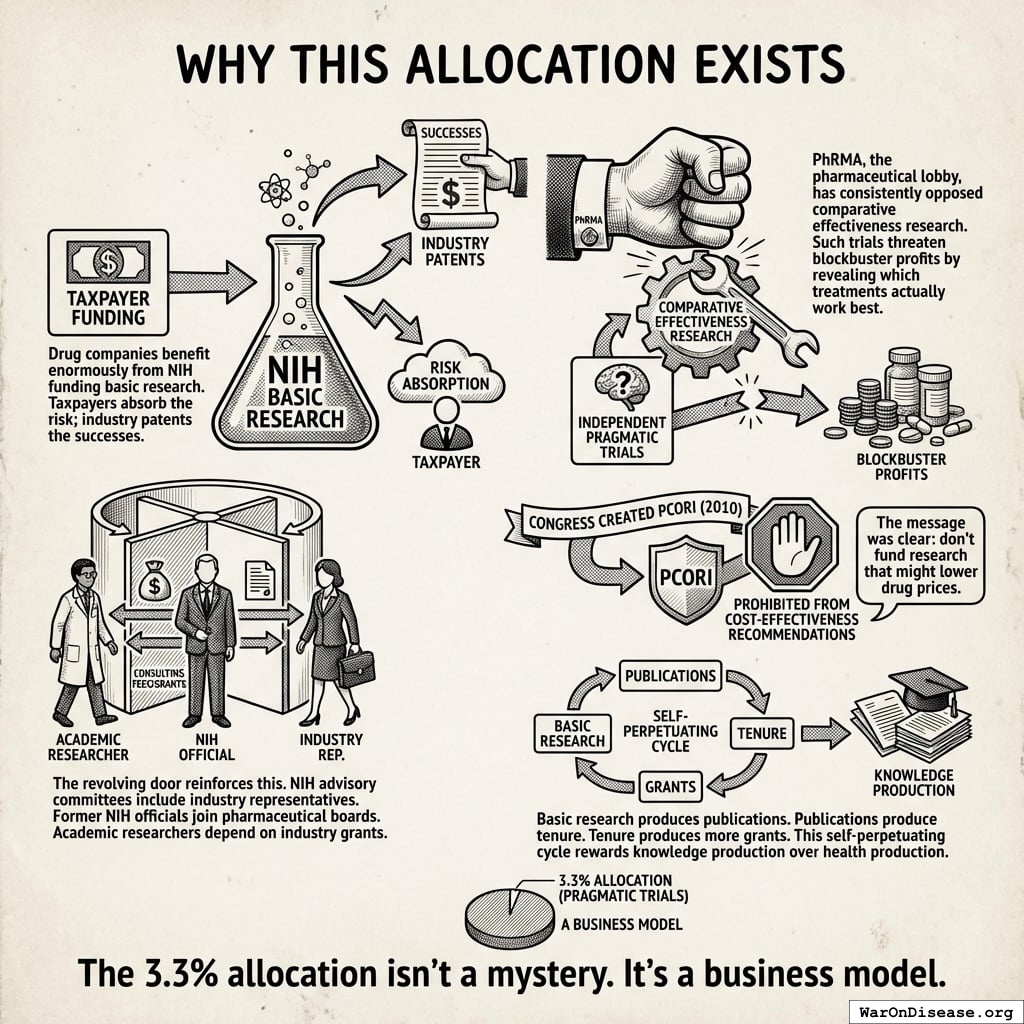 Drug companies benefit enormously from NIH funding basic research. Taxpayers absorb the risk; industry patents the successes. But independent pragmatic trials comparing drugs head-to-head? Those threaten blockbuster profits by revealing which treatments actually work best.