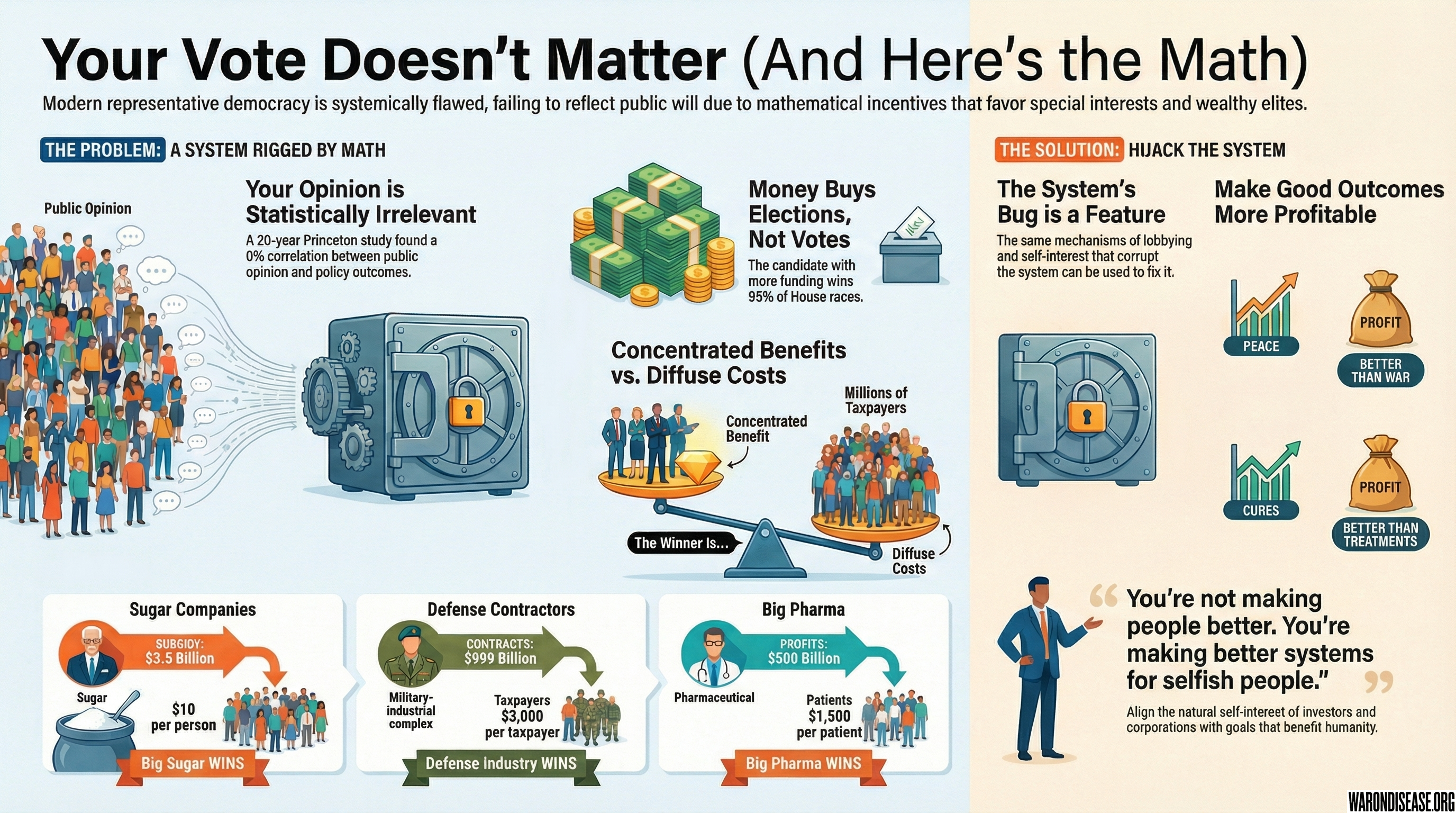 The same lobbying system that created this mess is the feature you will exploit. Lockheed Martin and Pfizer don’t love war and disease; they love money. By making health and peace the most profitable investments in history, you can hijack the system and buy your democracy back.
