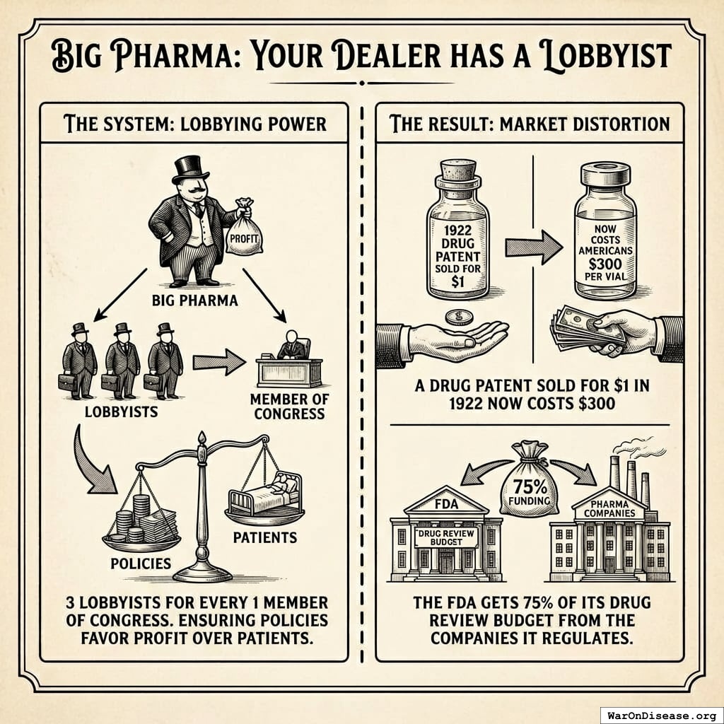 1923: Frederick Banting, Charles Best, James Collip sold insulin patent to U. of Toronto for $1 each (total $3) Banting: Unethical for doctor to profit from life-saving discovery; wanted everyone to afford it Manufacturing cost: $6 per vial US retail price: $300-332 per vial (Humalog: $21 in 1999 → $332 in 2019 = 1,000%+ increase) Price increases: 600% over 20 years; 200% between 2007-2018 Patients without insurance: Up to $1,000/month Contributing factors: Patent evergreening, barriers to biosimilar entry, market concentration (Eli Lilly, Novo Nordisk, Sanofi) Additional sources: https://www.snopes.com/fact-check/insulin-patent-dollar/ | https://www.t1international.com/100years/ | https://pnhp.org/news/why-insulin-is-overpriced/ | https://www.npr.org/2019/06/18/733742630/desperate-measures-the-skyrocketing-price-of-insulin-in-america