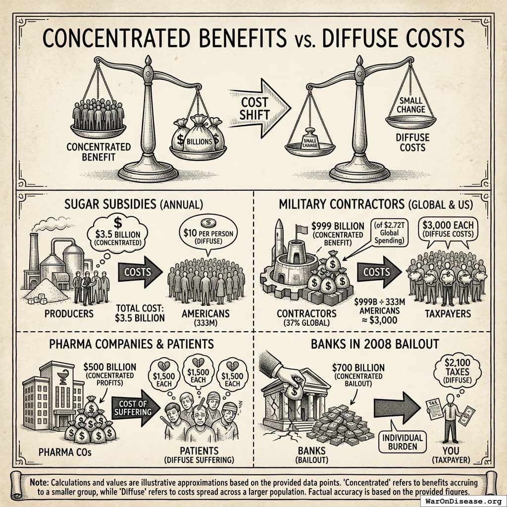 - Taxpayers: $3,000 each in diffuse costs ($999B ÷ 333M Americans)