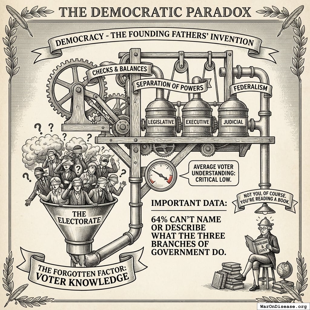 Not you, of course. You’re reading a book. But the average voter? 64% can’t name or describe what the three branches of government do139.