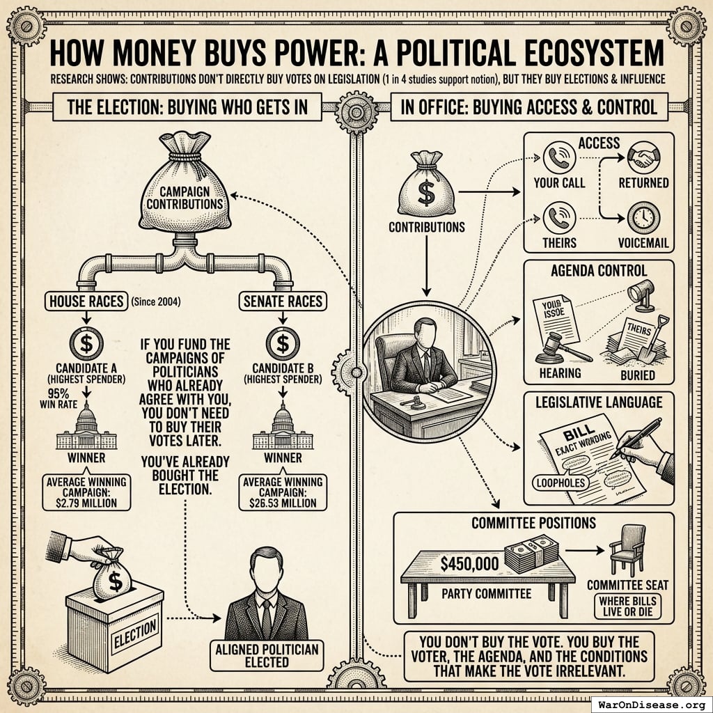 If you fund the campaigns of politicians who already agree with you, you don’t need to buy their votes later. You’ve already bought the election.