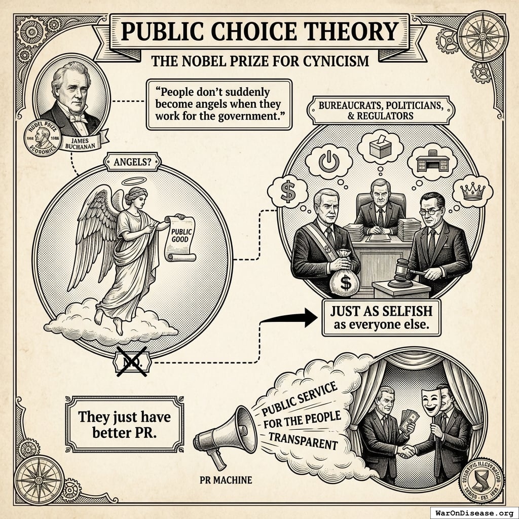 James McGill Buchanan: 1986 Nobel Memorial Prize in Economic Sciences Citation: "for his development of the contractual and constitutional bases for the theory of economic and political decision-making Field: Public choice theory (leading researcher & cofounder with Gordon Tullock) Key work: "The Calculus of Consent" (with Tullock) - now considered a classic, started the field Contribution: Transferred concept of gain from mutual exchange between individuals to political decision-making; applied economic analysis to public sector Inspiration: Swedish economist Knut Wicksell (described as "most exciting intellectual moment" of career) Additional sources: https://www.nobelprize.org/prizes/economic-sciences/1986/press-release/ | https://en.wikipedia.org/wiki/James_M._Buchanan | https://www.britannica.com/money/James-M-Buchanan | https://www.econlib.org/library/Enc/bios/Buchanan.html