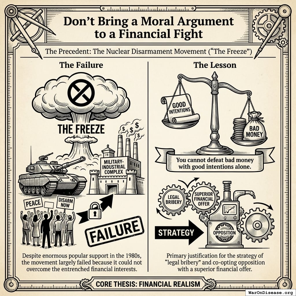 - The Failure: Despite enormous popular support in the 1980s, the movement largely failed because it could not overcome the entrenched financial interests of the military-industrial complex.