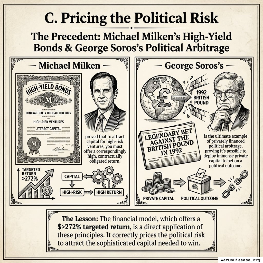 The Lesson: The financial model, which offers a $>272% targeted return, is a direct application of these principles. It correctly prices the political risk to attract the sophisticated capital needed to win.