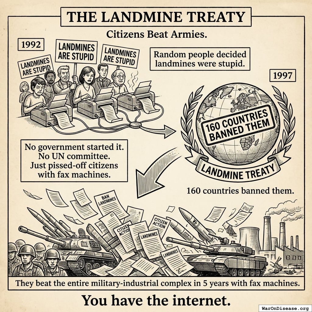 1992: Random people decided landmines were stupid. 1997: 160 countries banned them90.