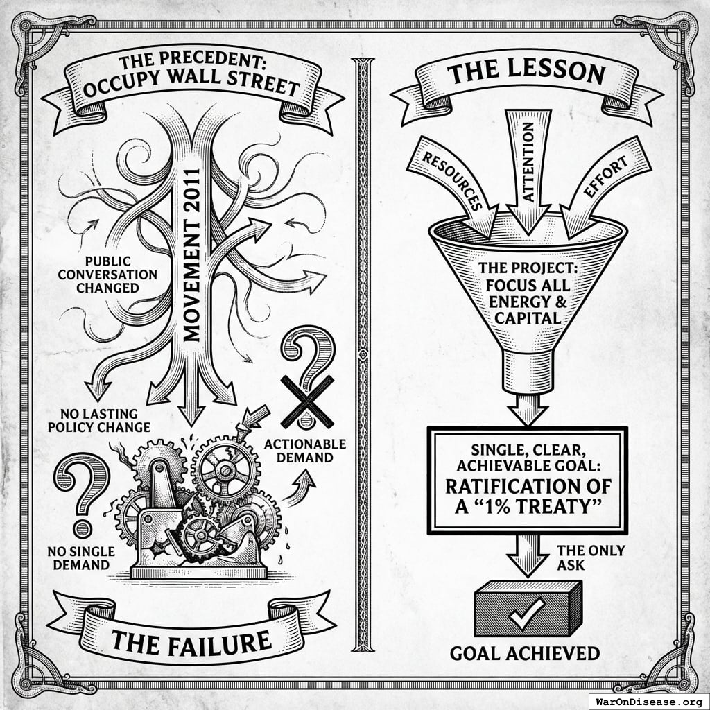 - The Lesson: The project avoids this trap by focusing all energy and capital on a single, clear, and achievable goal: ratification of a “1% treaty.” That is the only ask.